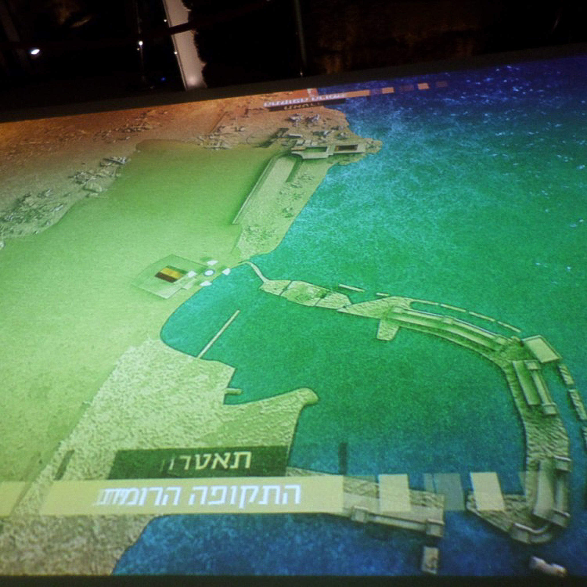 Display in the museum shows the history of the harbor. This looks like an image of the Herodian breakwaters with the addition of the wharf, temple, hippodrome, and Herod's Palace.