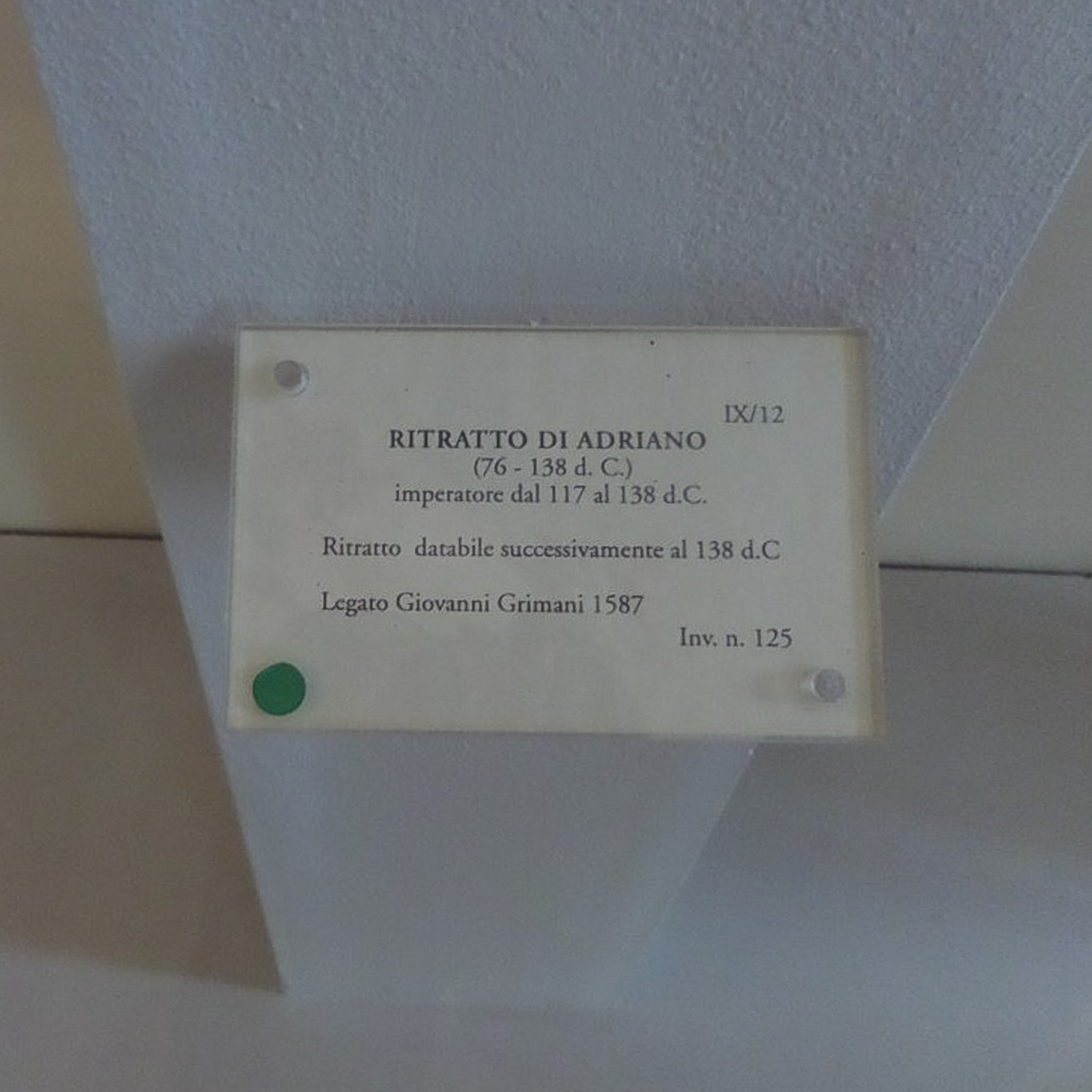 Multiple photos are associated with this record. Please click the links to view all of the items in the series. The photos were taken in the Royal Palace of Venice (in Italian: Il Palazzo Reale) in the San Marco district on the island of Venice, Italy. Venice (Venezia) is a city in northeastern Italy that is built on a group of 126 islands separated by open water and canals, linked through 472 bridges. The historical island city is home to only 51K people, but a very popular tourist destination with about 60K tourists per day. A UNESCO World Heritage Site, it is renowned for its beauty, architecture, and artwork. The landmark of St. Mark's Square (Piazza di San Marco) is the basilica dedicated to Saint Mark the Evangelist and contains his relics. The church is sited on the eastern end of the square, the former center of the Republic of Venice, and is attached to the Doge's Palace. There are other important landmarks around this square, such as the Royal Palace of Venice, which is a complex that consists of the Marciana Library, the Archaeological Museum, and the Correr Museum (Museo Correr). The Correr Museum's items originated with Teodoro Correr, a passionate collector who bequeathed his collection to the city of Venice in 1830. The photos show signage and a bust of Hadrian, the Roman emperor from 117 to 138 CE. The sculpture dates back to after his death.