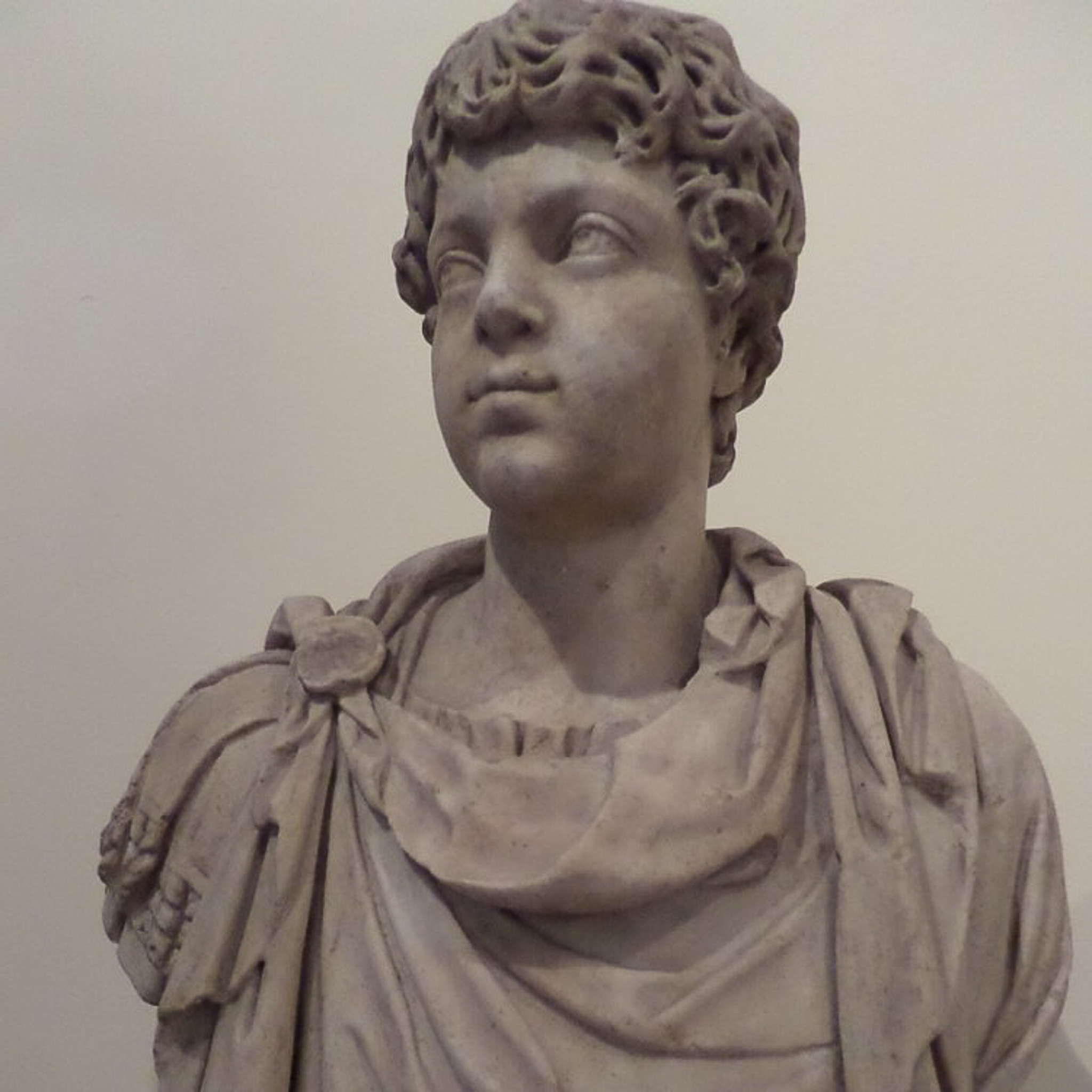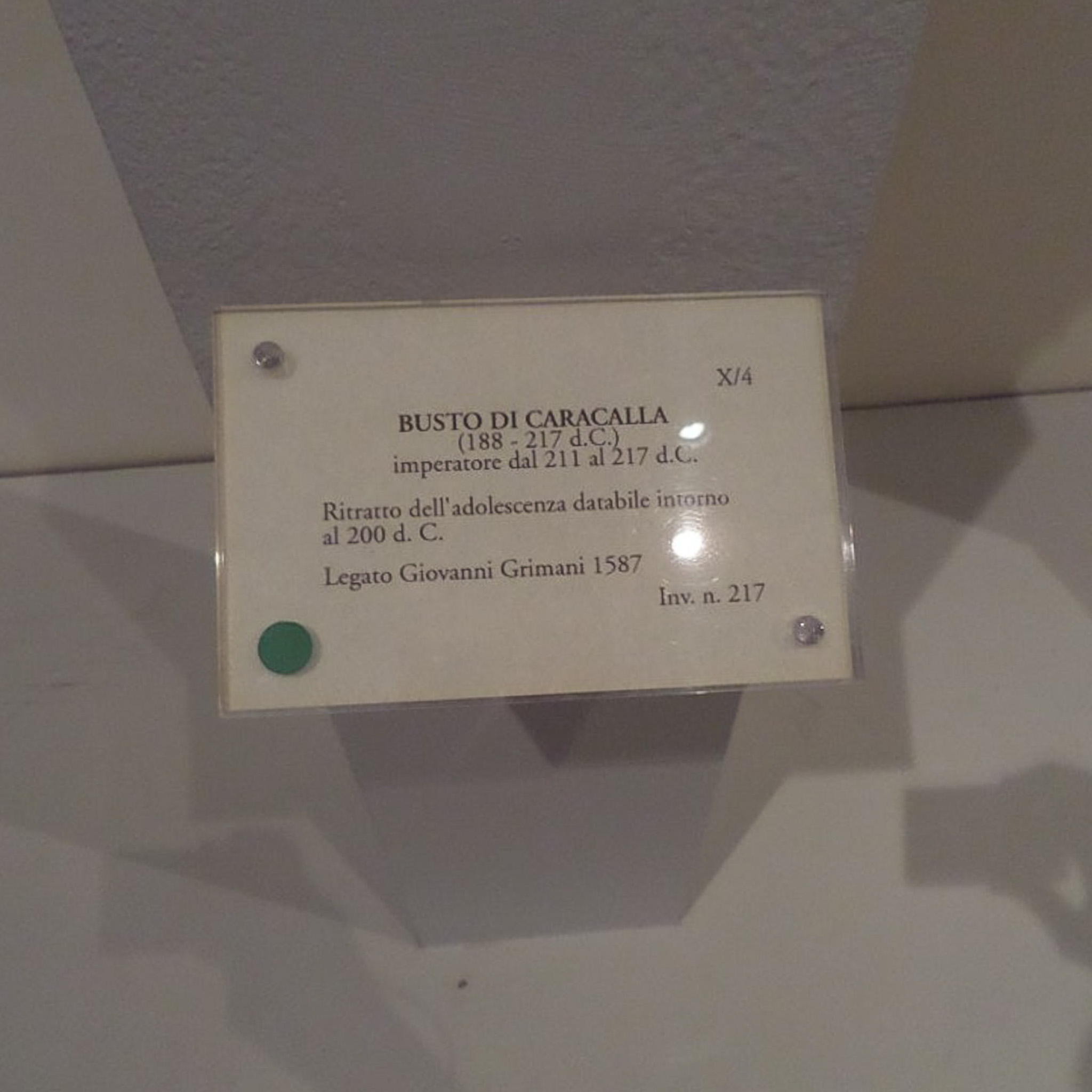 Multiple photos are associated with this record. Please click the links to view all of the items in the series. The photos were taken in the Royal Palace of Venice (in Italian: Il Palazzo Reale) in the San Marco district on the island of Venice, Italy. Venice (Venezia) is a city in northeastern Italy that is built on a group of 126 islands separated by open water and canals, linked through 472 bridges. The historical island city is home to only 51K people, but a very popular tourist destination with about 60K tourists per day. A UNESCO World Heritage Site, it is renowned for its beauty, architecture, and artwork. The landmark of St. Mark's Square (Piazza di San Marco) is the basilica dedicated to Saint Mark the Evangelist and contains his relics. The church is sited on the eastern end of the square, the former center of the Republic of Venice, and is attached to the Doge's Palace. There are other important landmarks around this square, such as the Royal Palace of Venice, which is a complex that consists of the Marciana Library, the Archaeological Museum, and the Correr Museum (Museo Correr). The Correr Museum's items originated with Teodoro Correr, a passionate collector who bequeathed his collection to the city of Venice in 1830. The photos show signage and a bust of the adolescent Marcus Aurelius Antoninus, better known as Caracalla, who was a Roman emperor from 198 (senior from 211) until his death in 217 CE. He and his brother Geta ruled jointly after their father's death in 211, but Caracalla soon arranged to have his brother murdered and became the sole ruler of the Roman Empire. A 4th century historian speculated that Caracalla gained his nickname after a Gallic hooded tunic that he customarily wore and made fashionable.