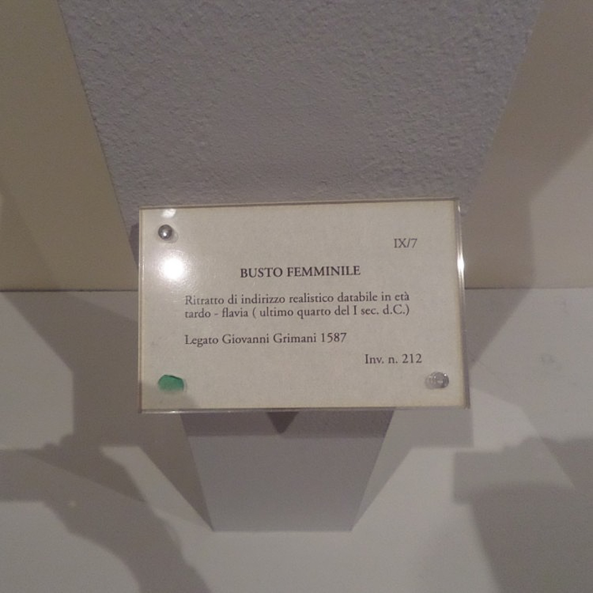 Multiple photos are associated with this record. Please click the links to view all of the items in the series. The photos were taken in the Royal Palace of Venice (in Italian: Il Palazzo Reale) in the San Marco district on the island of Venice, Italy. Venice (Venezia) is a city in northeastern Italy that is built on a group of 126 islands separated by open water and canals, linked through 472 bridges. The historical island city is home to only 51K people, but a very popular tourist destination with about 60K tourists per day. A UNESCO World Heritage Site, it is renowned for its beauty, architecture, and artwork. The landmark of St. Mark's Square (Piazza di San Marco) is the basilica dedicated to Saint Mark the Evangelist and contains his relics. The church is sited on the eastern end of the square, the former center of the Republic of Venice, and is attached to the Doge's Palace. There are other important landmarks around this square, such as the Royal Palace of Venice, which is a complex that consists of the Marciana Library, the Archaeological Museum, and the Correr Museum (Museo Correr). The Correr Museum's items originated with Teodoro Correr, a passionate collector who bequeathed his collection to the city of Venice in 1830. The photos show signage and a female bust that is a realistic portrait dating back to the late Flavian period (last quarter of the 1st century CE).