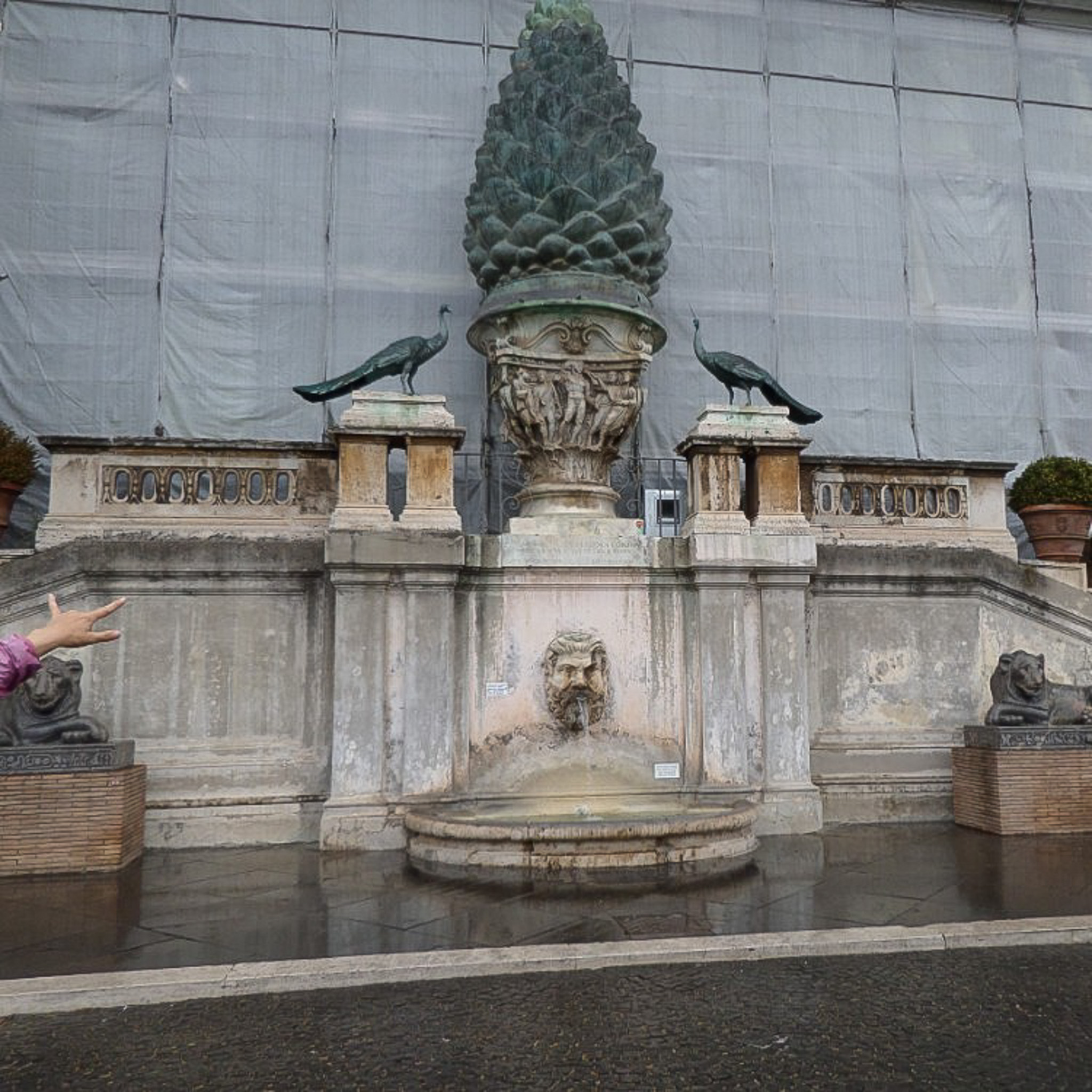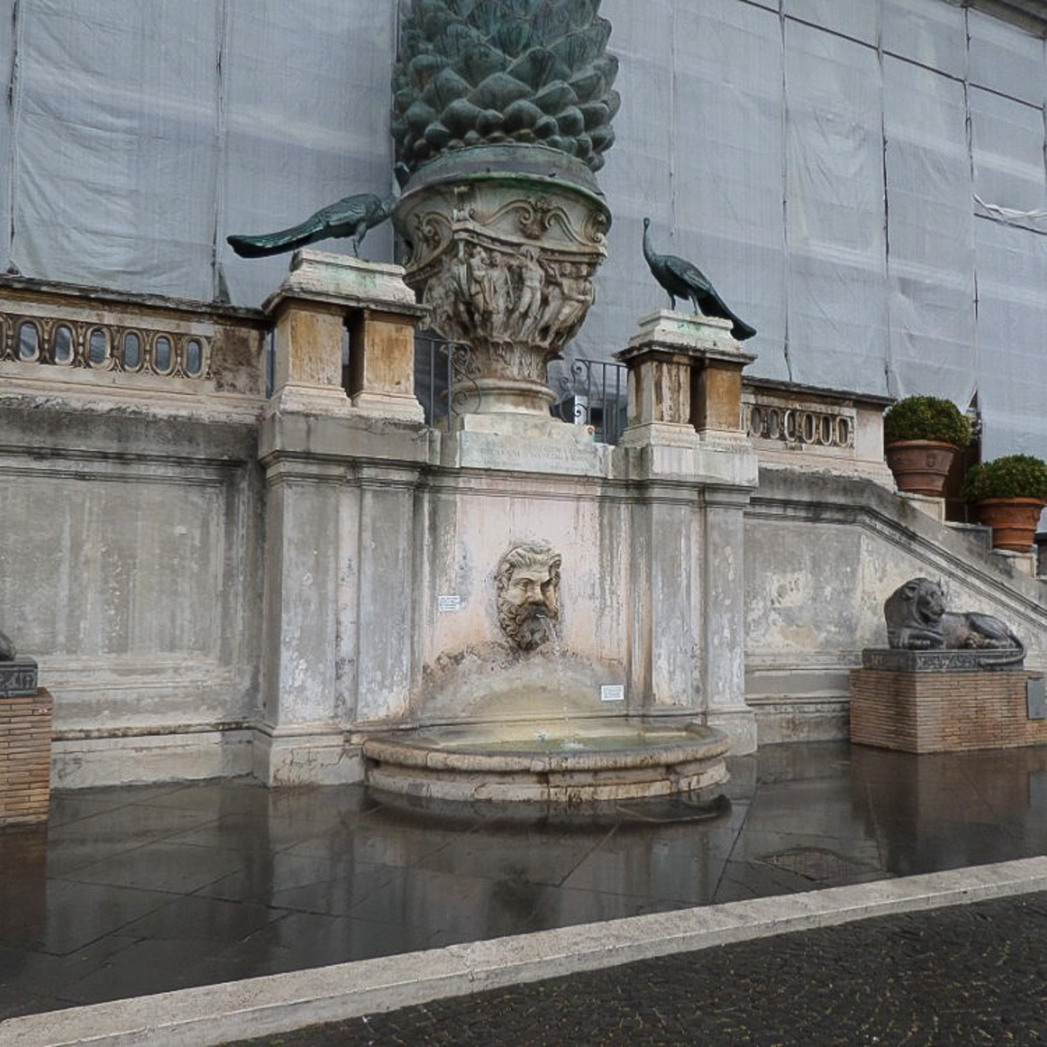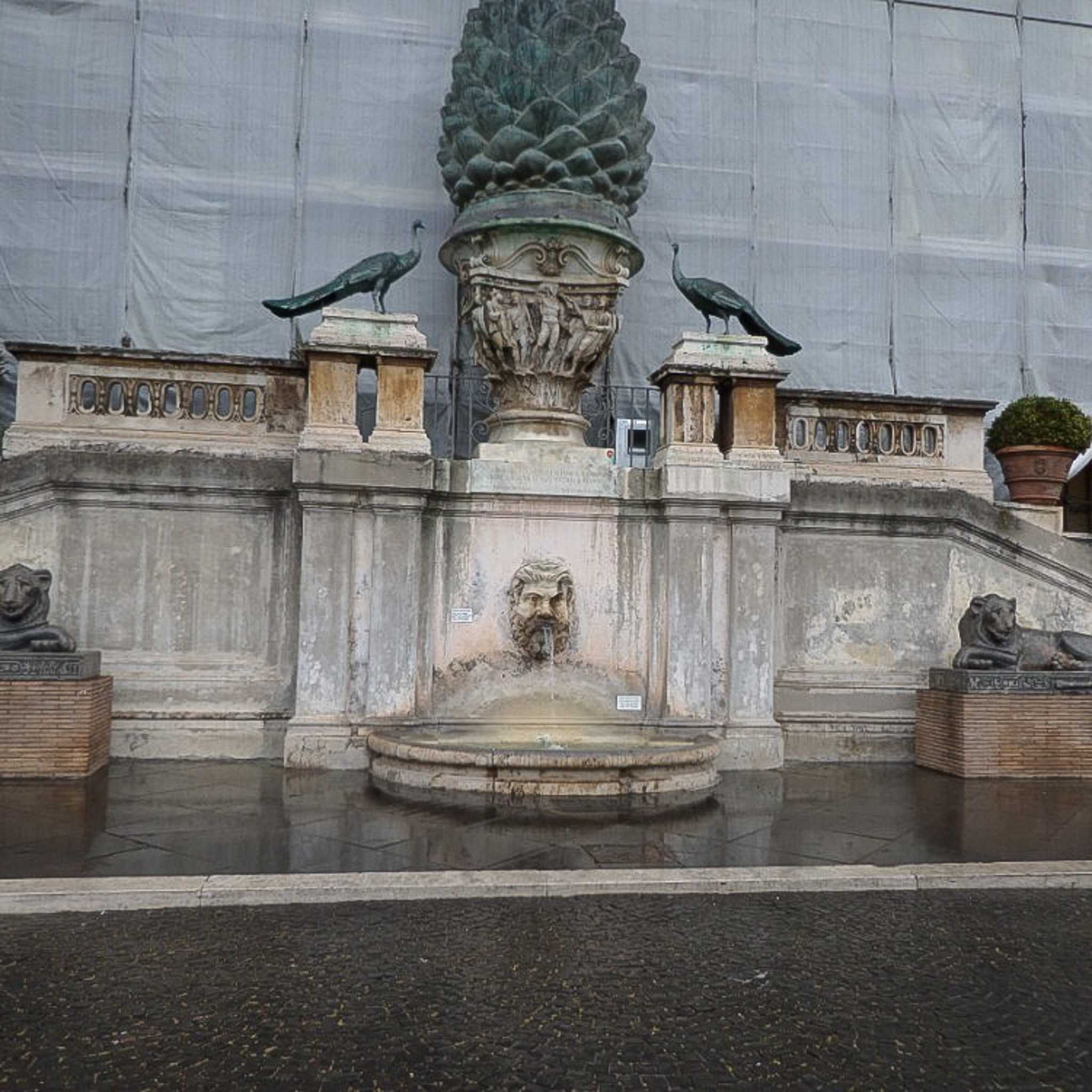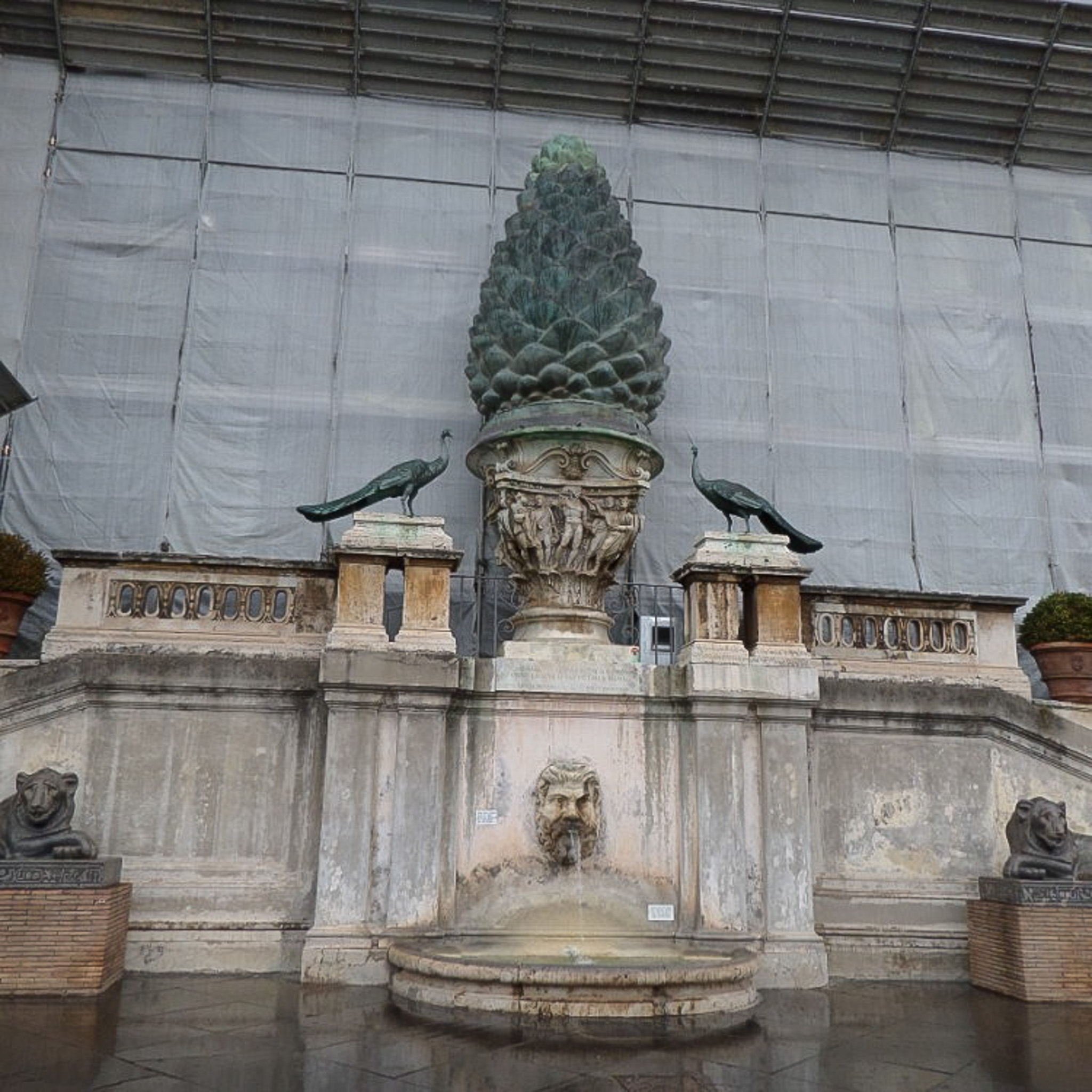 Multiple photos are associated with this record. Please click the links to view all of the items in the series. The images are of the Pinecone Fountain (Fontana della Pigna), which is in a niche of the wall of the Vatican facing the Pinecone Courtyard (Cortile della Pigna). The bronze pinecone once spouted water from its top and originally stood near the Pantheon, then was moved during the Middle Ages, and finally to its present location in 1608. The bronze peacocks are copies of those that decorate the tomb of Emperor Hadrian; the originals are held in the collection of the New Wing (Braccio Nuovo) of the Chiaramonti Museum, which is part of the Vatican Museums. The Pinecone Fountain was undergoing renovations when these photographs were taken in 2017.