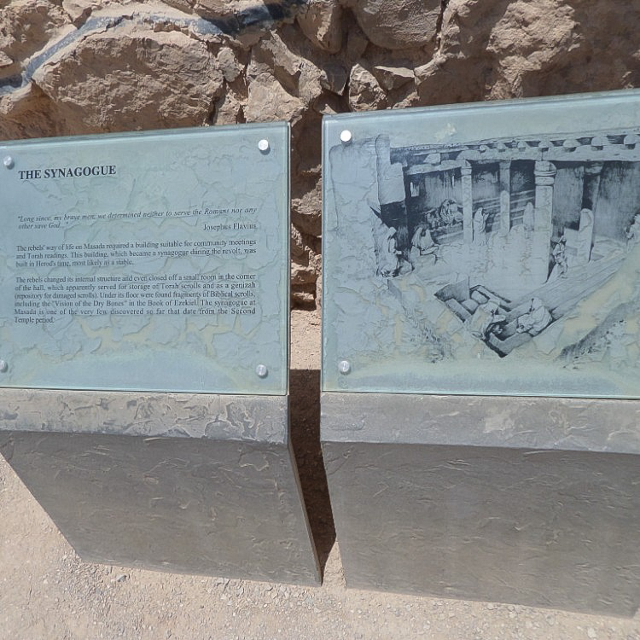 This sign mentions that the synagogue was likely adapted from a Herodian era stable by the Rebels who occupied the site during the Jewish-Roman war. A second panel of the site includes a sketch of what the structured looked like during the 1st Century.