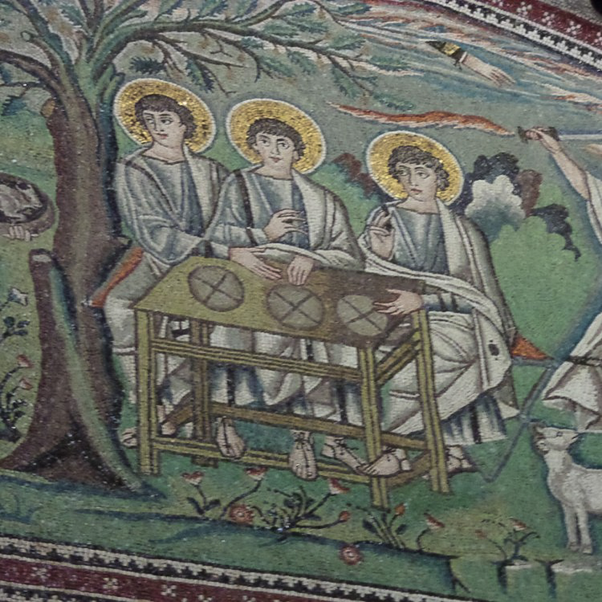 Partial image of the central mosaic in the left lunette of the Presbytery, Basilica San Vitale (Basilica of St. Vitale; Church of Saint Vitale) in Ravenna, Italy. The featured mosaic contains two episodes from the life of Abraham. The photo shows part of the left episode, in which Abraham receives word from three angels seated at a table under a leafy oak tree that Sarah will give birth to a son, Isaac. The photo is a detail of the three angels with golden halos, but part of the right episode is visible: the hand of God appears above the angel on the right, to stay the sword of Abraham, who is about to sacrifice his son at God's demand.