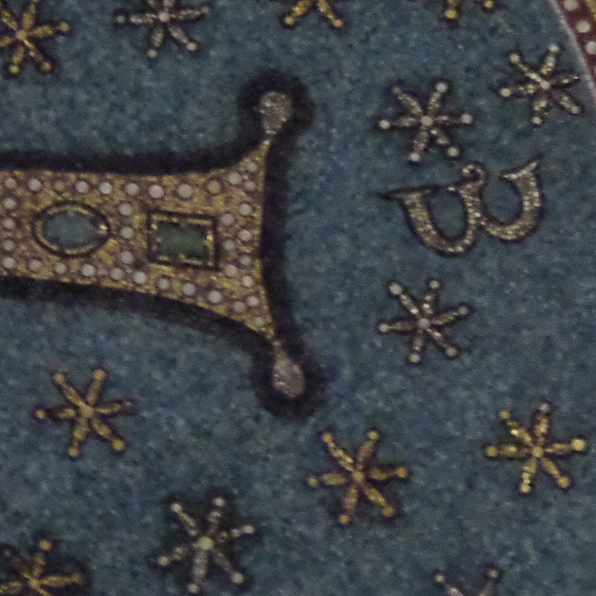 The Greek letter Omega appears amongst a field of stars in a mosaic that includes a golden cross in the Basilica of St. Apollinare in Classe (or Basilica of Sant'Apollinare in Classe, or Saint Apollinaris in Classe), which is located in Ravenna, Italy. This is a Christian symbol denoting that like the first and last letters of the Greek alphabet, Christ is the beginning and the end.
