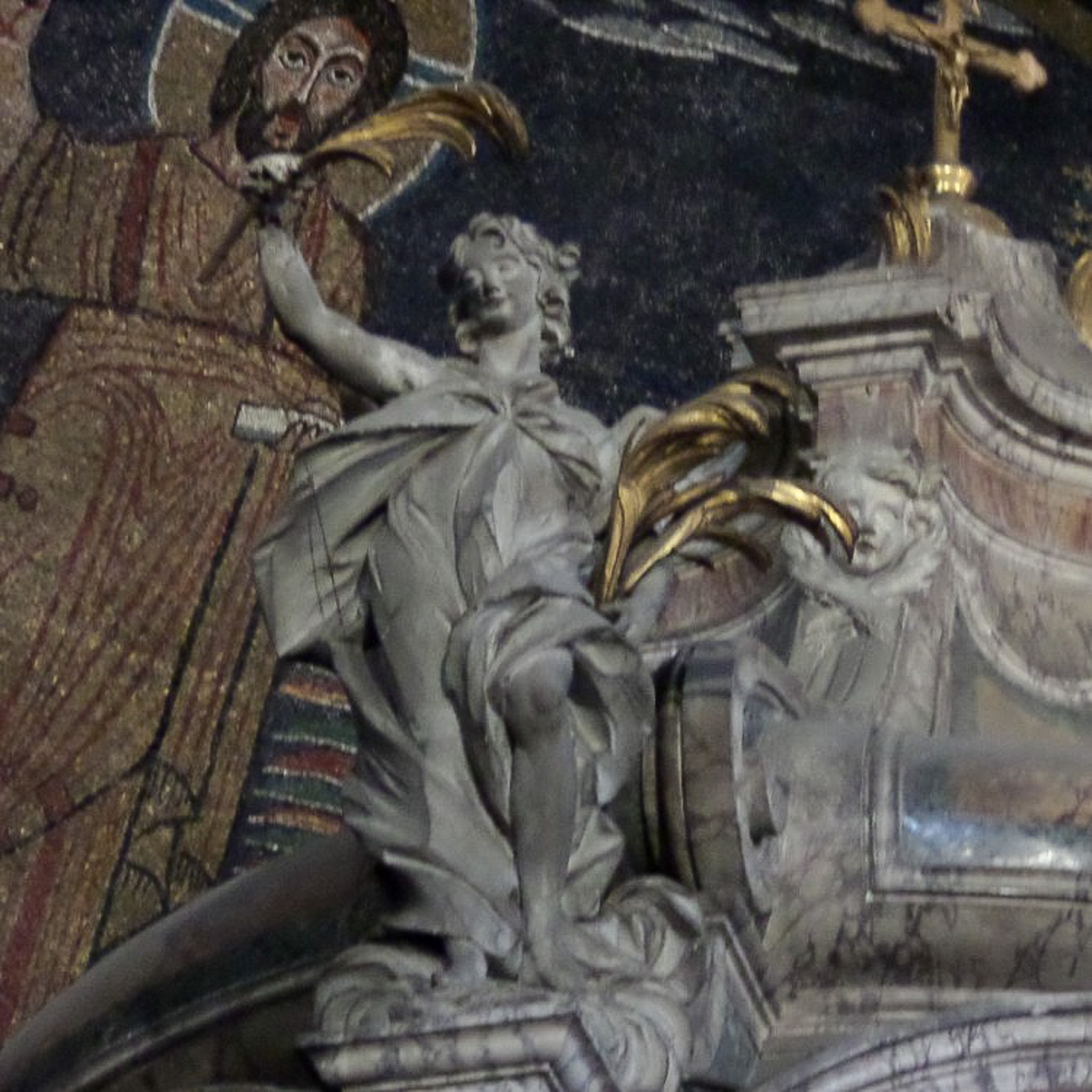 The Basilica of Saint Praxedes (in Italian: Basilica di Santa Prassede, commonly known as Santa Prassede) is a Catholic basilica located in the Rione Esquilino (or district of Esquiline). Esquiline is the name of a Roman hill, one of seven on which the ancient city was built. The church was rebuilt by Pope Pasquale I in 822 CE and was restored multiple times since then. It was built principally as a resting place for the relics of Roman martyrs and was dedicated to the second-century Saint Praxedes, who was the daughter of a Roman senator. Along with her sister, Praxedes provided comfort and care to Christians persecuted in the Roman Empire. The sisters were murdered for burying early Christian martyrs, which defied Roman law. The church is known for being the most important example of early Christian Byzantine art in Rome because of the mosaics decorating its apse and side chapels. The high altar is emphasized with a baldachin topping four porphyry and multiple marble columns. This elaborate structure of Baroque style was built by the order of Cardinal Luigi Pico della Mirandola in 1730. The photograph shows a detail image of a marble sculpture that tops a corner of the baldachin. The mosaic of Christ in the background of the photo is part of the apse conch mosaic's artwork.