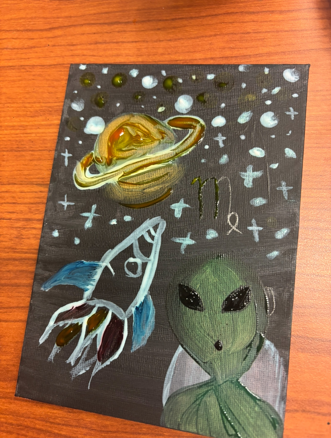 This is a painting that features a white spaceship, green alien, and planet against a black backdrop.