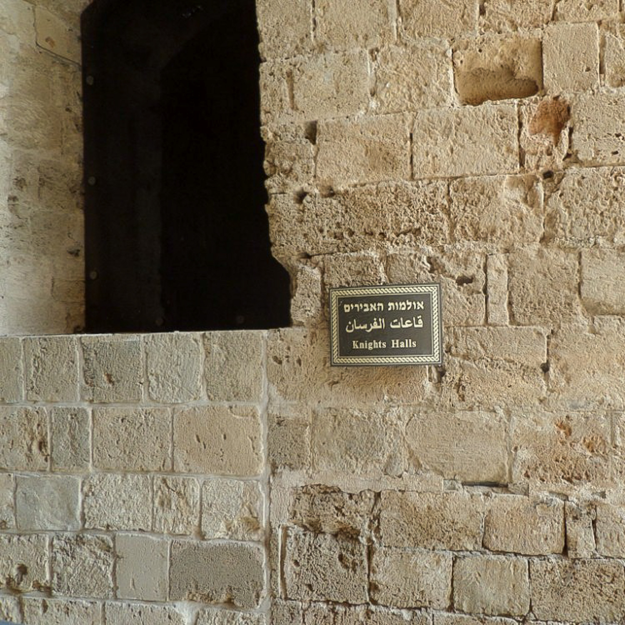 A sign provides direction to the Knights Halls portion of the citadel. It is part of the 12th -13th century structure built by the Hospitallers. The walls throughout the complex are trimmed sandstone.