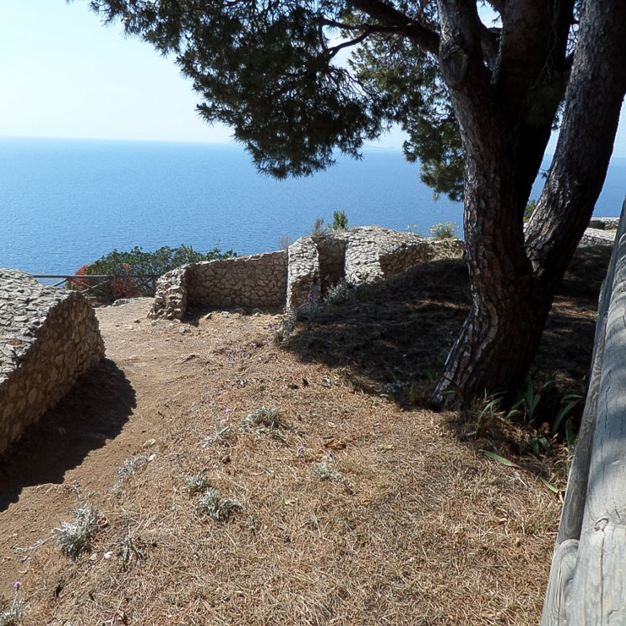 Remains of Villa Damecuta, which is one of twelve Augustan-Tiberian Roman villas on the Island of Capri, Italy. The Roman villa is in ruins today due to the eruption of Vesuvius in 79 A.D. and many raids by pirates. The ruins is located a short walk between the Blue Grotto and the municipality of Anacapri. "Damecuta" is derived from "Domus Cuta" (Dark and Hidden House), as Emperor Tiberius preferred small living spaces similar to caves. Augustus was the first Roman emperor and was succeeded by his stepson, Tiberius.