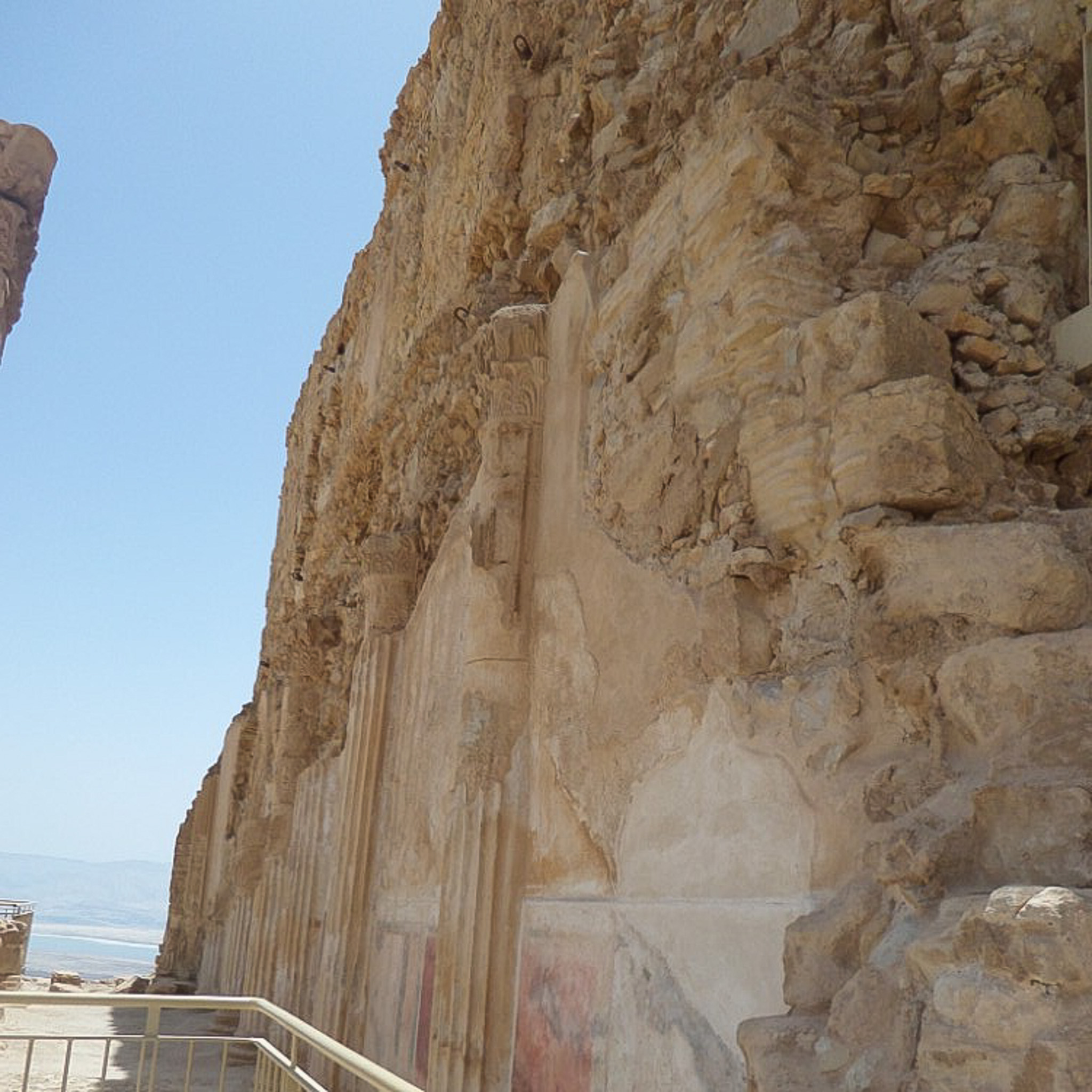 The lower level of the Northern Palace that hung from the northern tip of the plateau had elaborate decorations. Here one can see the remains of colored frescoes. There are also columns topped with Corinithian capitals. Although imitating the look of carved pilasters, the columns are actually blocks covered with plaster in a way to represent fluting.
