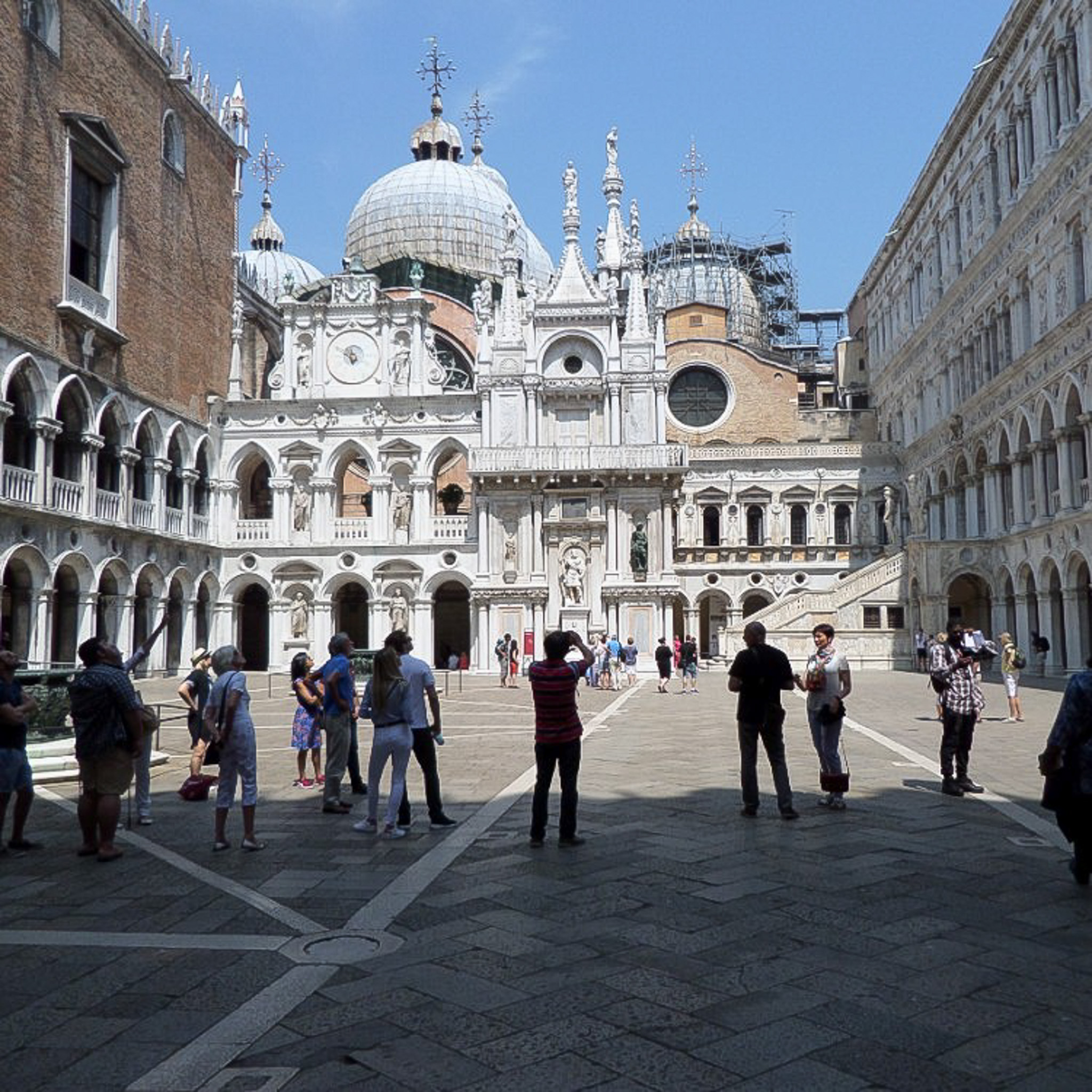 The photo shows the courtyard of the Doge's Palace (in Italian: Palazzo Ducale), which is located in the San Marco district on the island of Venice, Italy. Venice (Venezia) is a city in northeastern Italy that is built on a group of 126 islands separated by open water and canals, linked through 472 bridges. The historical island city is home to only 51K people, but a very popular tourist destination with about 60K tourists per day. A UNESCO World Heritage Site, it is renowned for its beauty, architecture, and artwork. The landmark of St. Mark's Square is the basilica dedicated to Saint Mark the Evangelist and contains his relics. The church is sited on the eastern end of the Piazza of San Marco, the former center of the Republic of Venice, and is attached to the Doge's Palace. The Doge (chief magistrate) of Venice was the supreme authority of the Republic of Venice when this palace was built in 1340. Opposite the entrance to the courtyard is the doge's chapel, which was the boundary between the Doge's Palace and St. Mark's Basilica. The chapel's marble facade with a clock dates from reconstruction work in 1615. The octagonal area in the pavement of the courtyard's foreground is a capped well. The triangular structure on the far right is a sideways view of the Giants' Staircase (Scala dei Giganti).