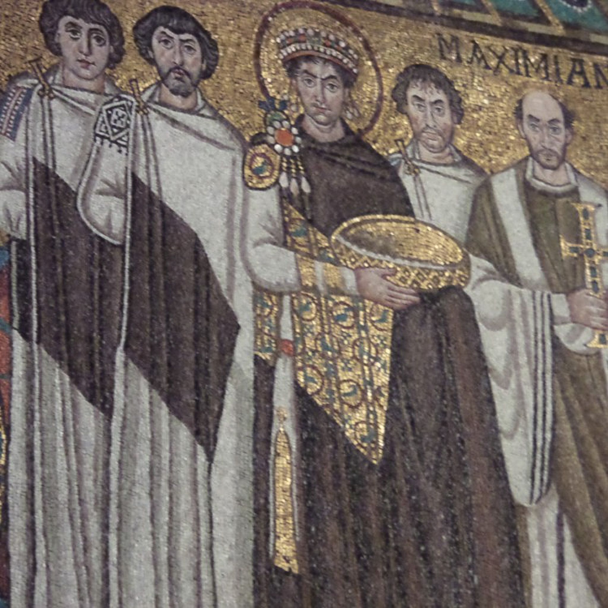 Detail of the mosaic art on the left side of the Presbytery apse in the Basilica San Vitale (Basilica of St. Vitale; Church of Saint Vitale) in Ravenna, Italy. This art depicts Emperor Justinian (central figure; haloed, crowned, purple robe, holding a golden paten), preceded by Archbishop Maximianus (identified by the inscription above him) and other clergy on his left. According to smarthistory.org/san-vitale/: "To Justinian�s right appear members of the imperial administration identified by the purple stripe, and at the very far left side of the mosaic appears a group of soldiers. This mosaic thus establishes the central position of the Emperor between the power of the church and the power of the imperial administration and military. Like the Roman Emperors of the past, Justinian has religious, administrative, and military authority."