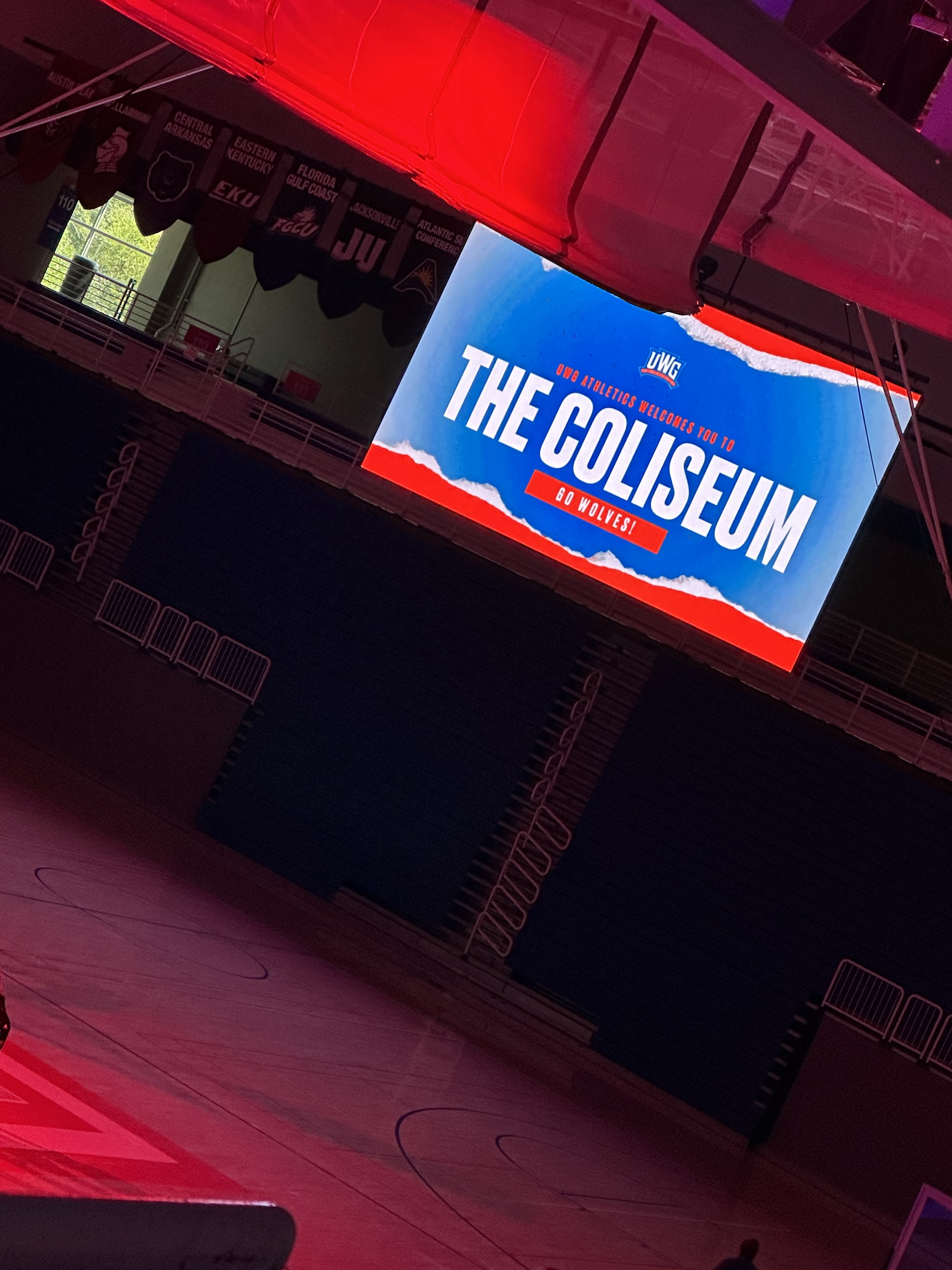 The photo lit with red reflects the red and blue colors of the University of West Georgia. Centered in the photo is the Jumbotron, a screen used to display scores and other information during games and events. The screen in this photo is displaying the name UWG has given to the gymnasium's building, "Coliseum," and the tagline, "Go Wolves."