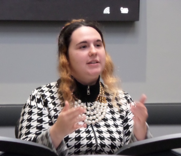 In this photo, taken at the 2024 Humanities Undergraduate Research Conference at the University of West Georgia, Megan Gorman presents "A Nietzschean Future" within the "Individual Community, Communication" panel. The conference took place on October 10, 2024. Gorman is wearing a black and white houndstooth jacket with a pearl necklace. The presentation venue was the Campus Center Ballroom.