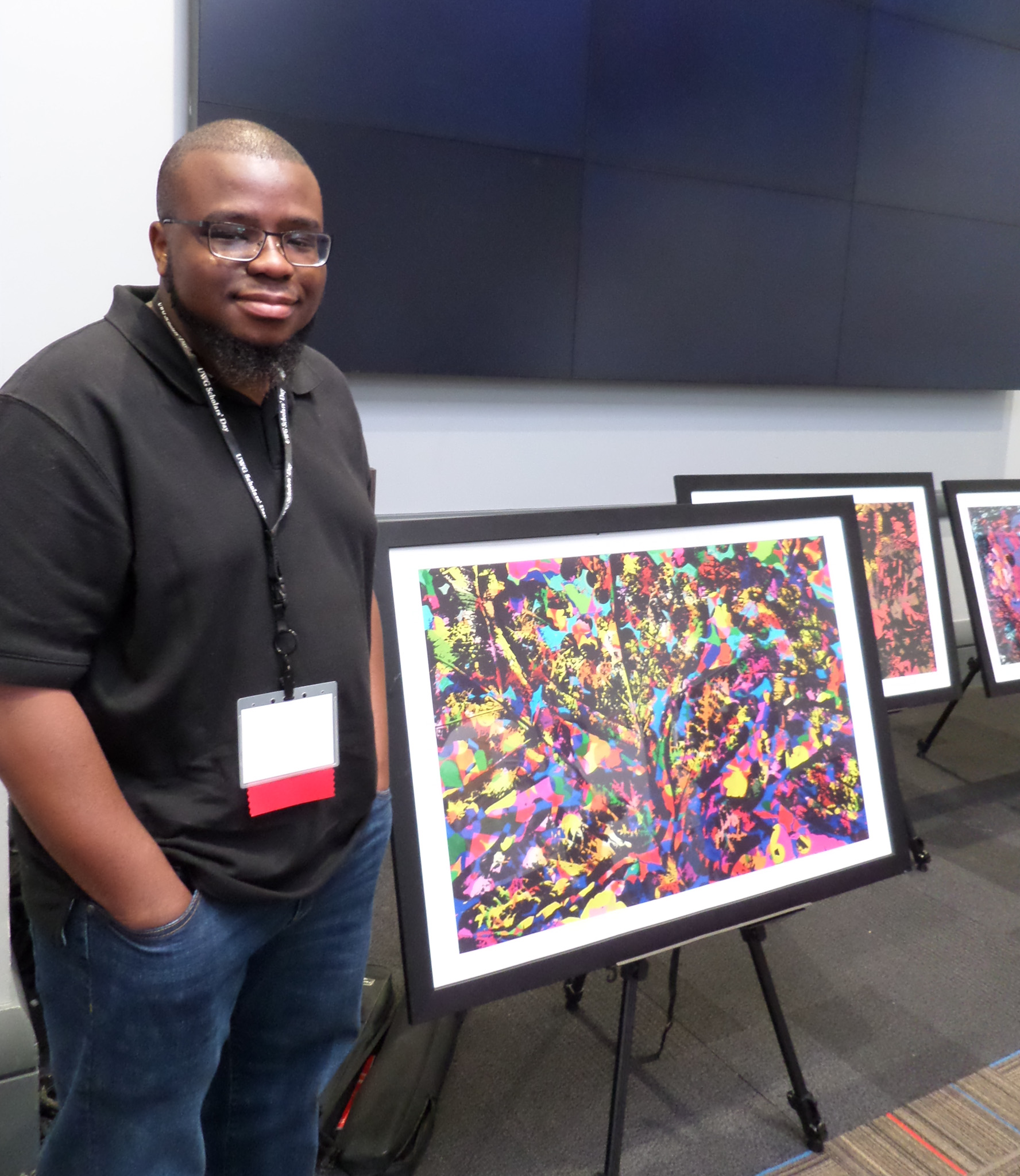 Kyree Durham stands next to easels holding several of his abstract artworks in the Campus Center ballroom as part of UWG's Scholars' Day poster presentations. His art includes the colors purple, fuchsia, yellow, and turquoise, amongst other colors. Durham's presentation was sponsored by faculty mentor, Professor Bryan Perry.