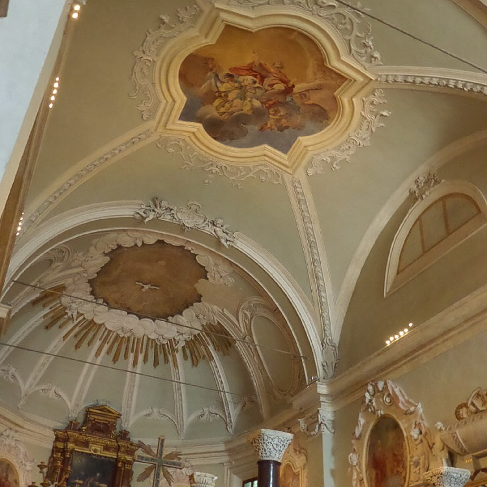 The apse ceiling of the Basilica of Sant'Apollinare Nuovo (Basilica di Sant'Apollinare Nuovo) in Ravenna, Italy. It features a central fresco. The apse was damaged in World War II and was reconstructed.