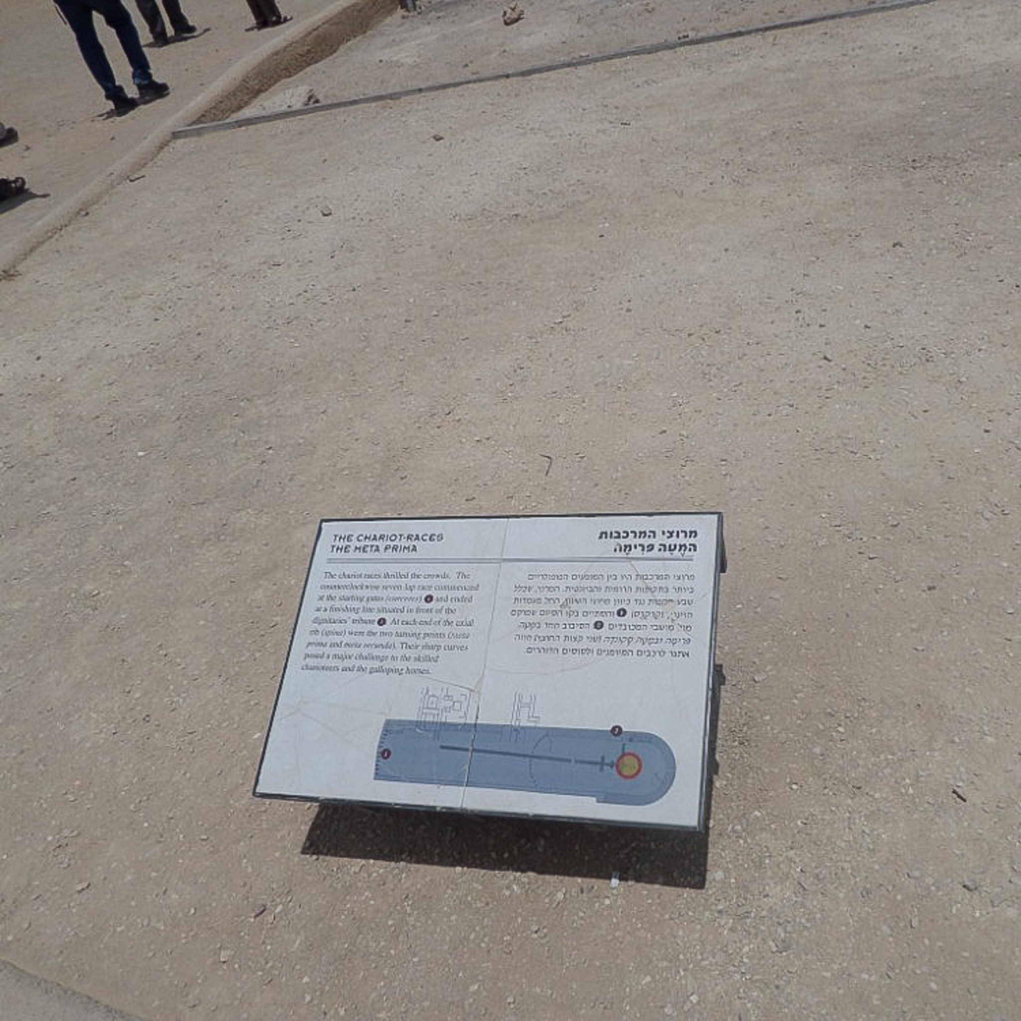 Signage describing the first turning point in a hippodrome horserace, or the Meta Prima.