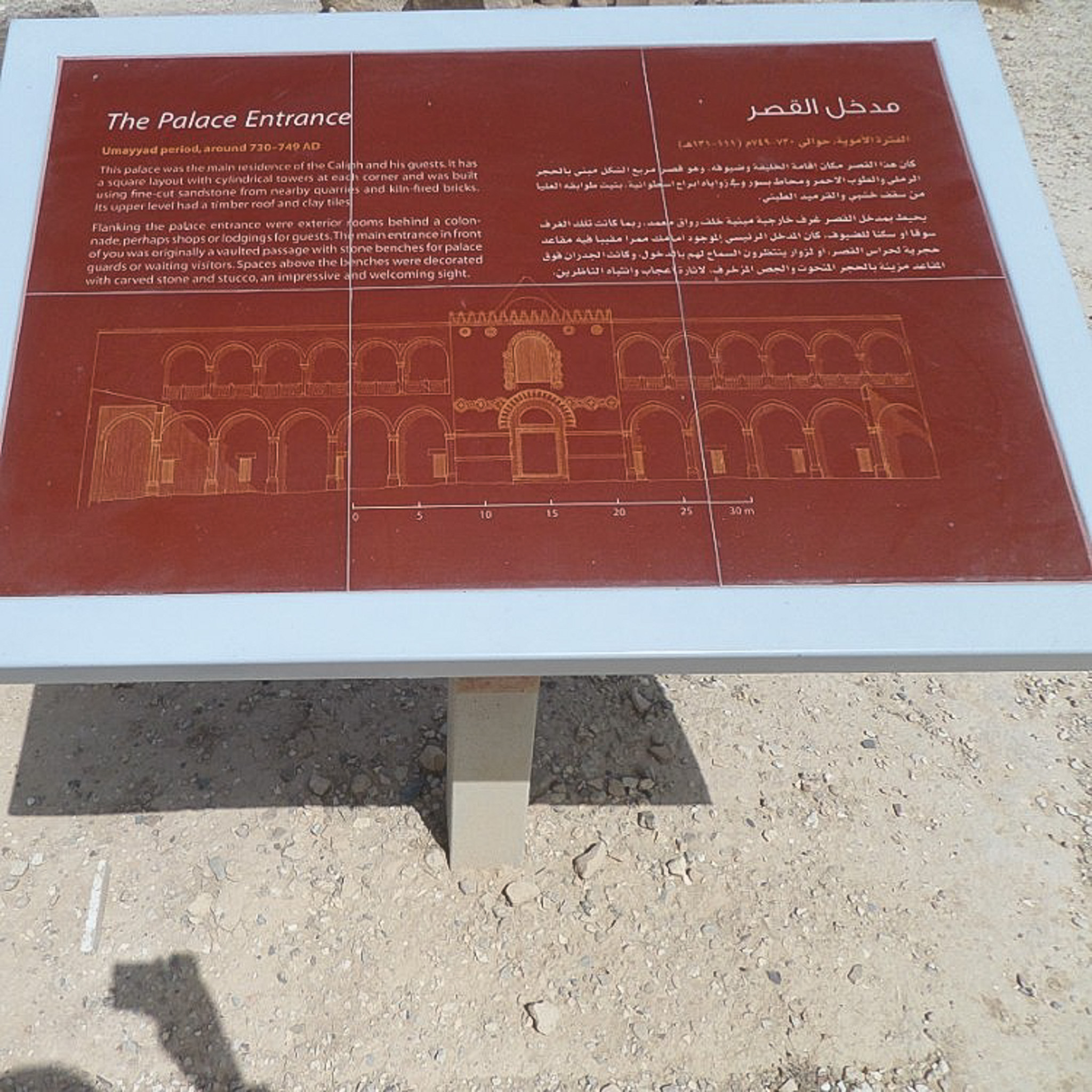A sign describing the Palace Entrance. It reads: The palace was the main residence of the Caliph and his guests. IT has a square layout with cylindrical towers at each corner and was built using fine-cut sandstone from nearby quarries and kiln-fired bricks. Its upper level had a timber roof and clay tiles. Flanking the palace entrance were exterior rooms bhind a colonnade, perhaps shops of lodgings for guests. The main entrance in front of you was originally a vaulted passage with stone benches for palace guards or waiting visitors. Spaces above the benches were decorated with carved stone and stucco, an impressive and welcoming sight.