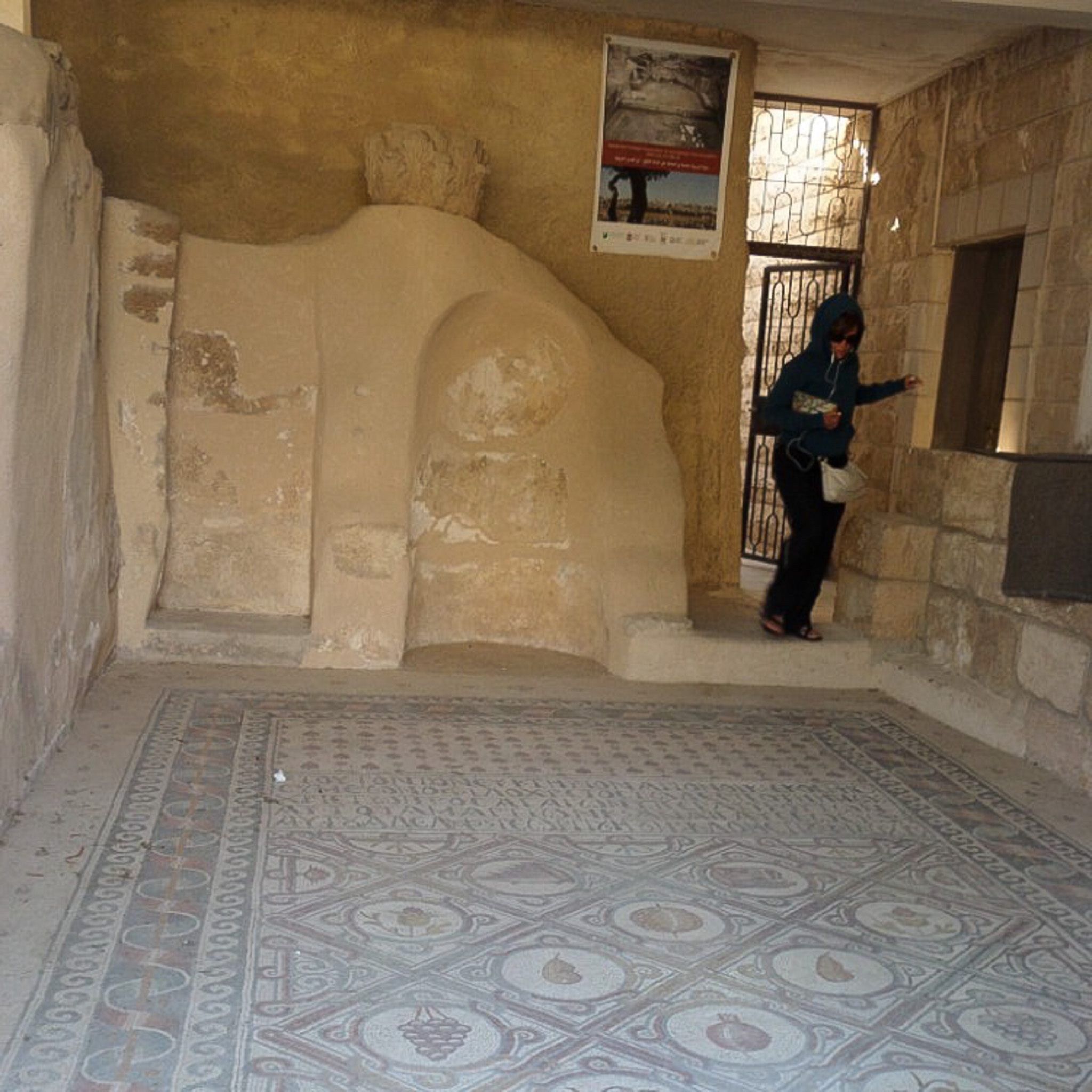 The Franciscan church, Dominus Flevit, commemorates Jesus' act of weeping from Luke 19:37-42. Byzantine era mosaics