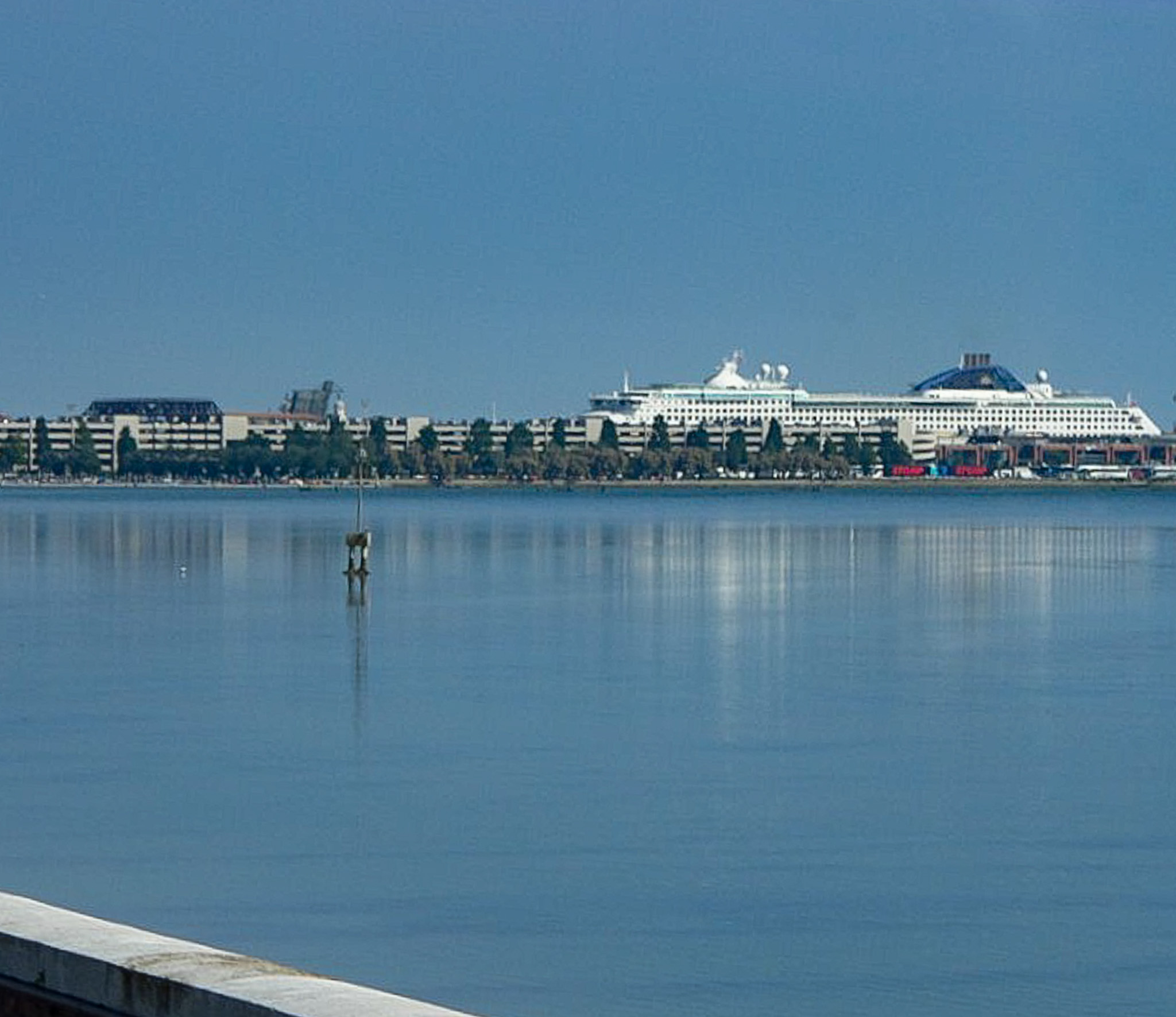 The photo shows a cruise ship docked in Venice, Italy. Venice (in Italian: Venezia) is a city in northeastern Italy that is built on a group of 126 islands separated by open water and canals, linked through 472 bridges. The historical island city is home to only 51K people, but a very popular tourist destination with about 60K tourists per day. A UNESCO World Heritage Site, it is renowned for its beauty, architecture, and artwork. This photo was taken on May 22, 2017, just eleven days before a cruise ship rammed a tourist riverboat. Since then, the Italian government passed regulations to divert large cruise ships away from the Giudecca Canal. Overtourism and global climate changes leading to flooding continue to threaten Venice's ecosystem.