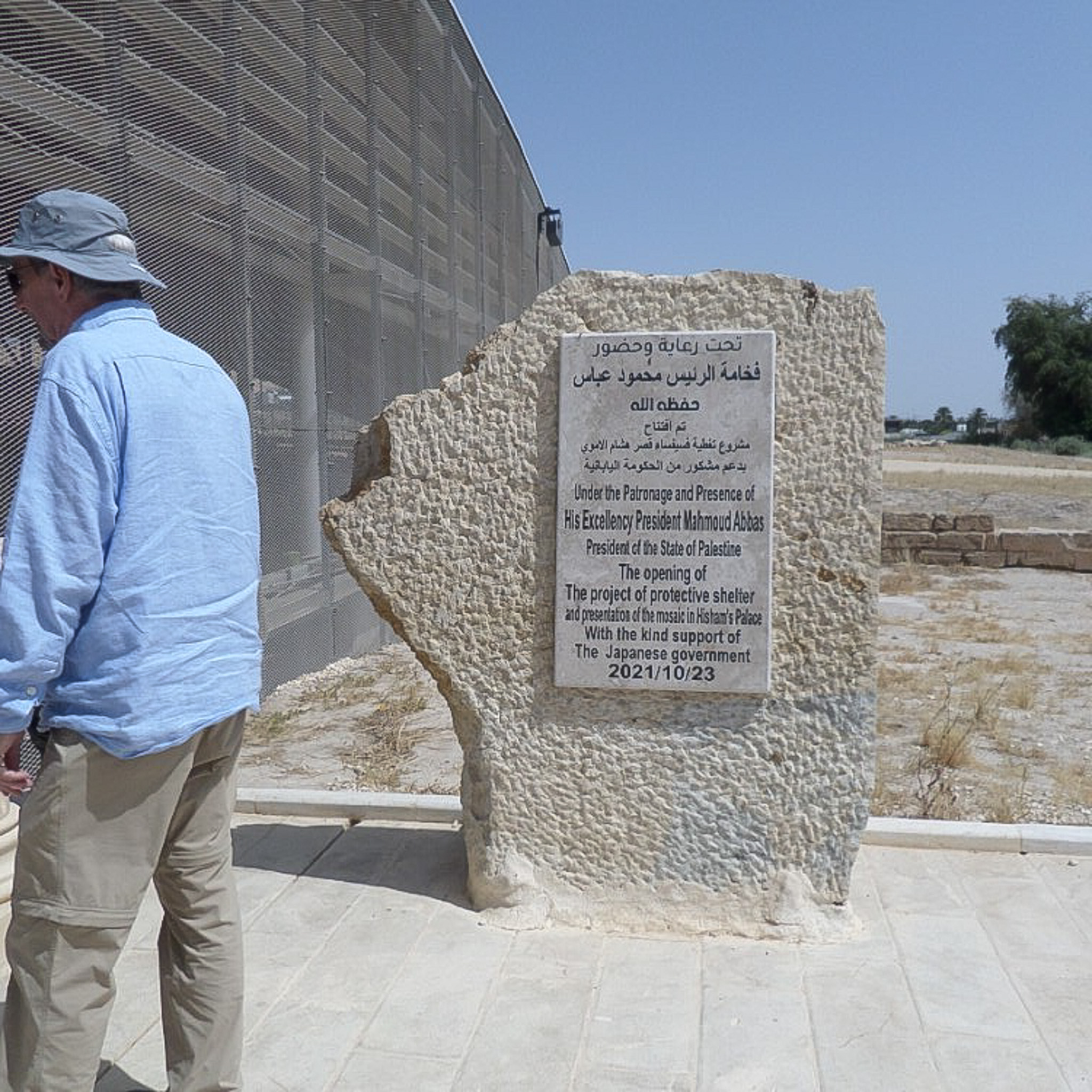 Signage for the covered structure that protects the audience hall mosaics reads: Under the patronage and presence of His Excellency President Mahmoud Abbas, President of the State of Palestine -- The opening of the project of protective shelter and presentation of the mosaic in Hisham's Palace with the kind support of the Japanese Government 2021/10/23.