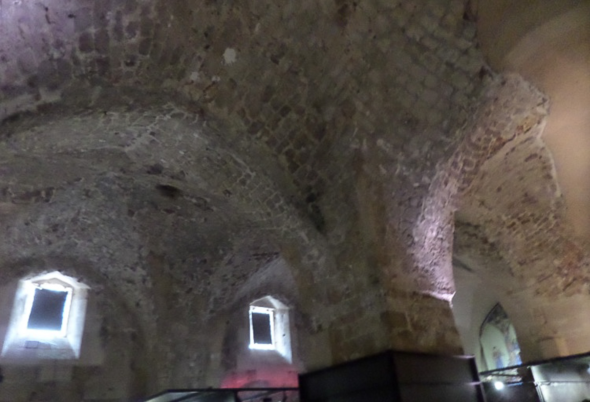 Columns support the vaulted ceiling in one of the sections of the Crusader Fortress. The light from the windows is blocked to preserve the displays and to avoid interference with the lighting scheme in the various display cases throughout the museum exhibit.