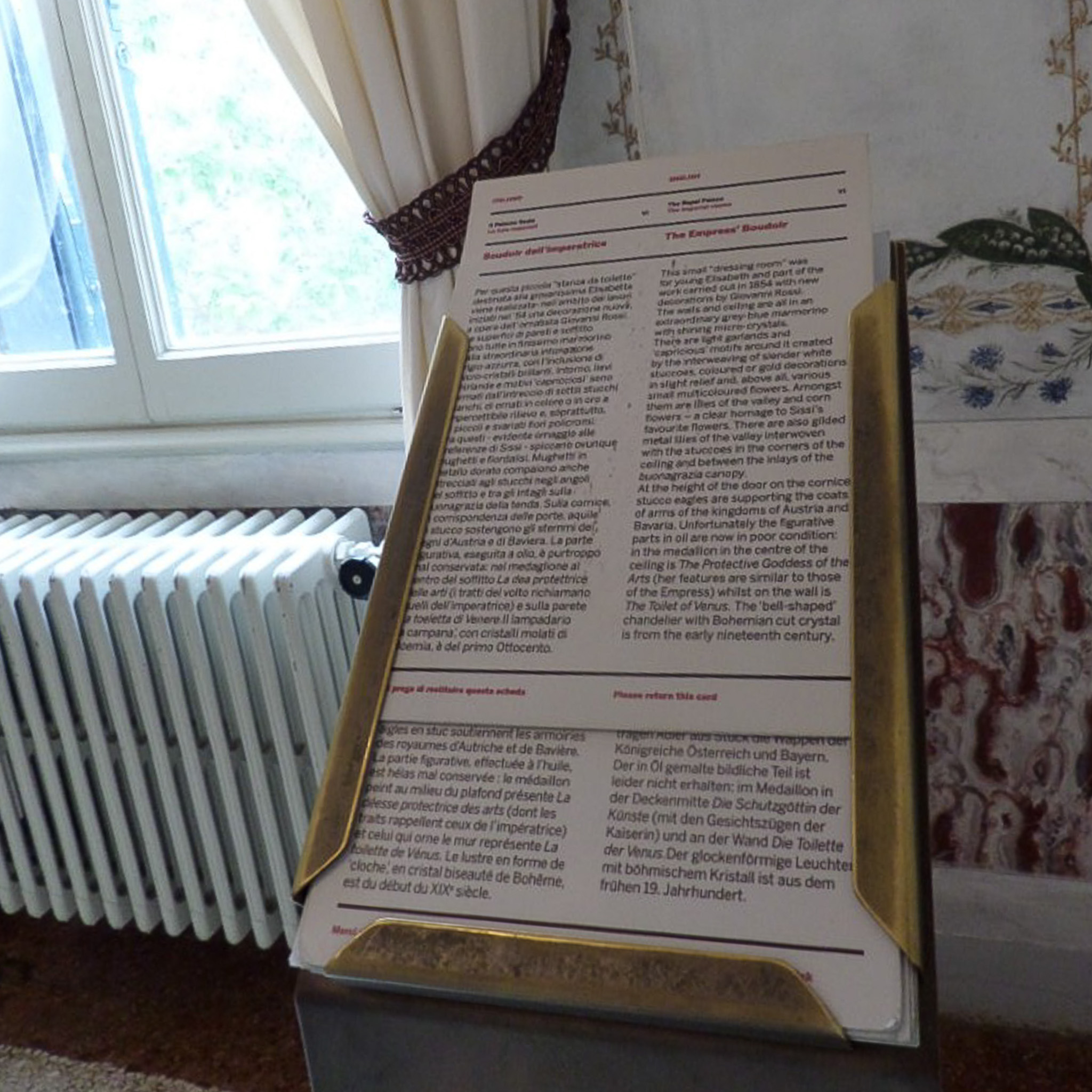 Multiple photos are associated with this record. Please click the links to view all of the items in the series. The photos were taken in the Royal Palace of Venice (in Italian: Il Palazzo Reale) in the San Marco district on the island of Venice, Italy. Venice (Venezia) is a city in northeastern Italy that is built on a group of 126 islands separated by open water and canals, linked through 472 bridges. The historical island city is home to only 51K people, but a very popular tourist destination with about 60K tourists per day. A UNESCO World Heritage Site, it is renowned for its beauty, architecture, and artwork. The landmark of St. Mark's Square (Piazza di San Marco) is the basilica dedicated to Saint Mark the Evangelist and contains his relics. The church is sited on the eastern end of the square, the former center of the Republic of Venice, and is attached to the Doge's Palace. There are other important landmarks around this square, such as the Royal Palace of Venice, which is a complex that consists of the Marciana Library, the Archaeological Museum, and the Correr Museum. These photos are of the Dressing Room of Empress Elisabeth and signage in the Correr Museum (Museo Correr), which is located in the Procuratorie Nuove building. The museum's items originated with Teodoro Correr, a passionate collector who bequeathed his collection to the city of Venice in 1830.