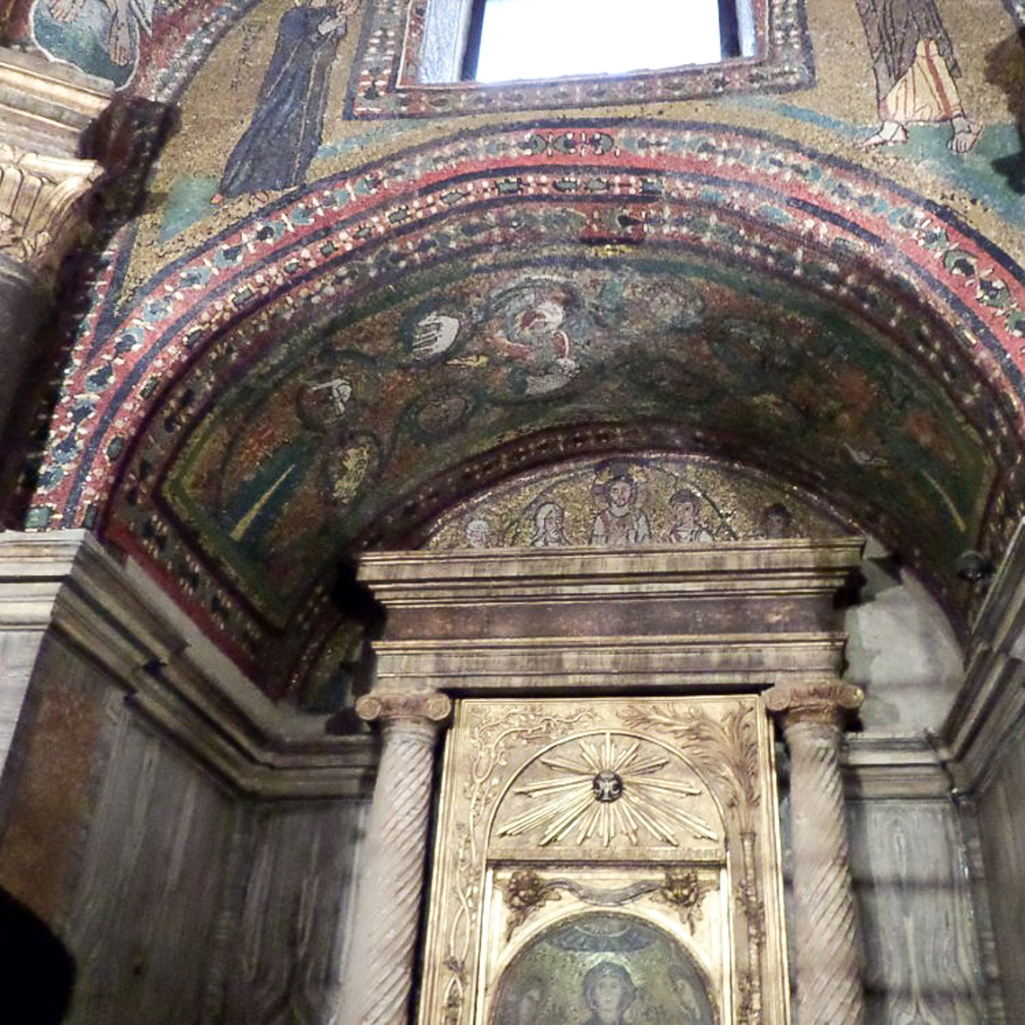 The Basilica of Saint Praxedes (in Italian: Basilica di Santa Prassede, commonly known as Santa Prassede) is a Catholic basilica located in the Rione Esquilino (or district of Esquiline). Esquiline is the name of a Roman hill, one of seven on which the ancient city was built. The church was rebuilt by Pope Pasquale I in 822 CE and was restored multiple times since then. It was built principally as a resting place for the relics of Roman martyrs and was dedicated to the second-century Saint Praxedes, who was the daughter of a Roman senator. Along with her sister, Praxedes provided comfort and care to Christians persecuted in the Roman Empire. The sisters were murdered for burying early Christian martyrs, which defied Roman law. The church is known for being the most important example of early Christian Byzantine art in Rome because of the mosaics decorating its apse and side chapels. The photograph shows part of the architecture and artwork of the right lateral Chapel of Saint Zeno (Cappella di San Zenone) within the Basilica. Pope Paschal built the funerary chapel for his mother, Theodora. The photograph shows the scene opposite the entrance. The top of the photograph cuts off the figures of the Virgin Mary and John the Baptist, who are gesturing to the east-facing window between them. This represents the Byzantine iconographical tradition of the Deesis (or Deisis), a Greek word meaning "entreaty" (supplication; prayer). The window is symbolic of Christ, as Christ was the Light of the World. Within this niche are fluted columns with Ionic capitals, topped with a mosaic lunette of Christ and his disciples. Between the columns is a 13th century mosaic of the Virgin and Child. The gilded Corinthian column capital in the upper left of the photograph supports the cross vaulted ceiling.