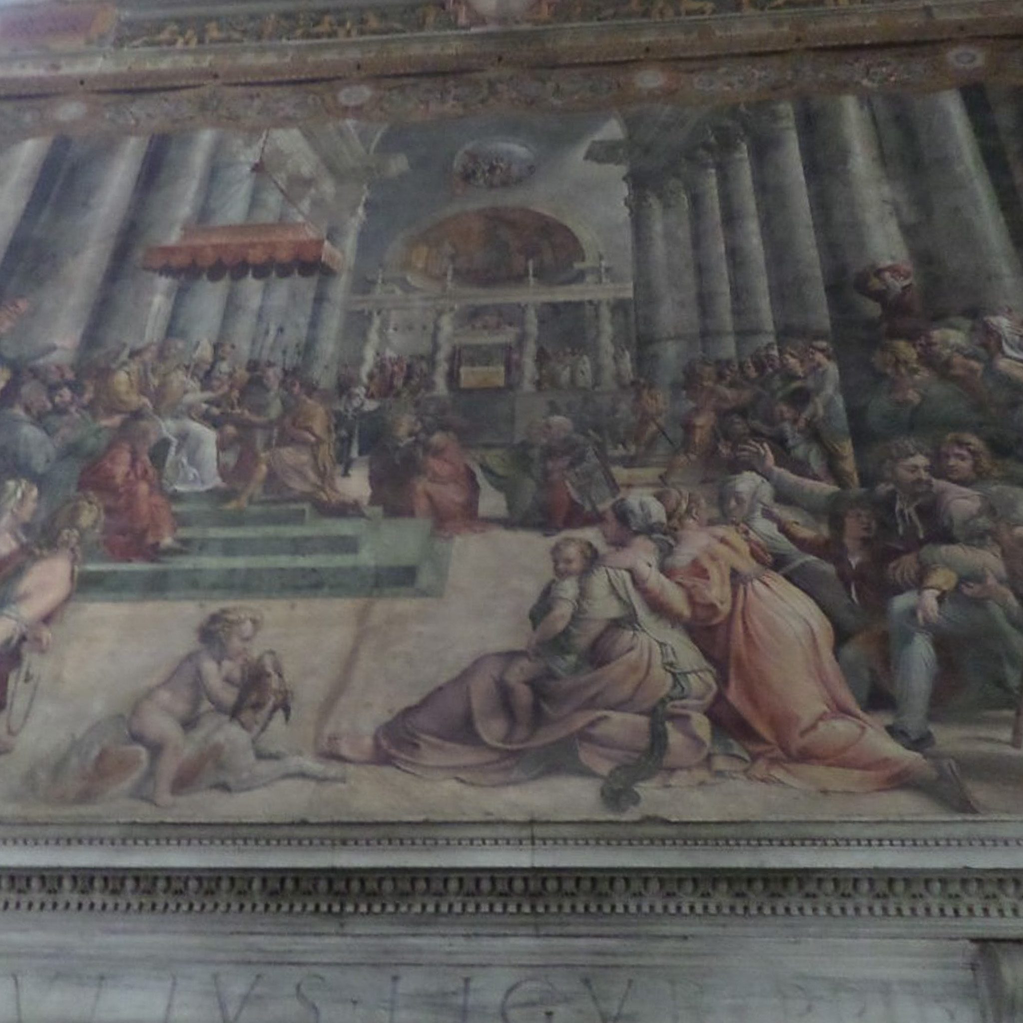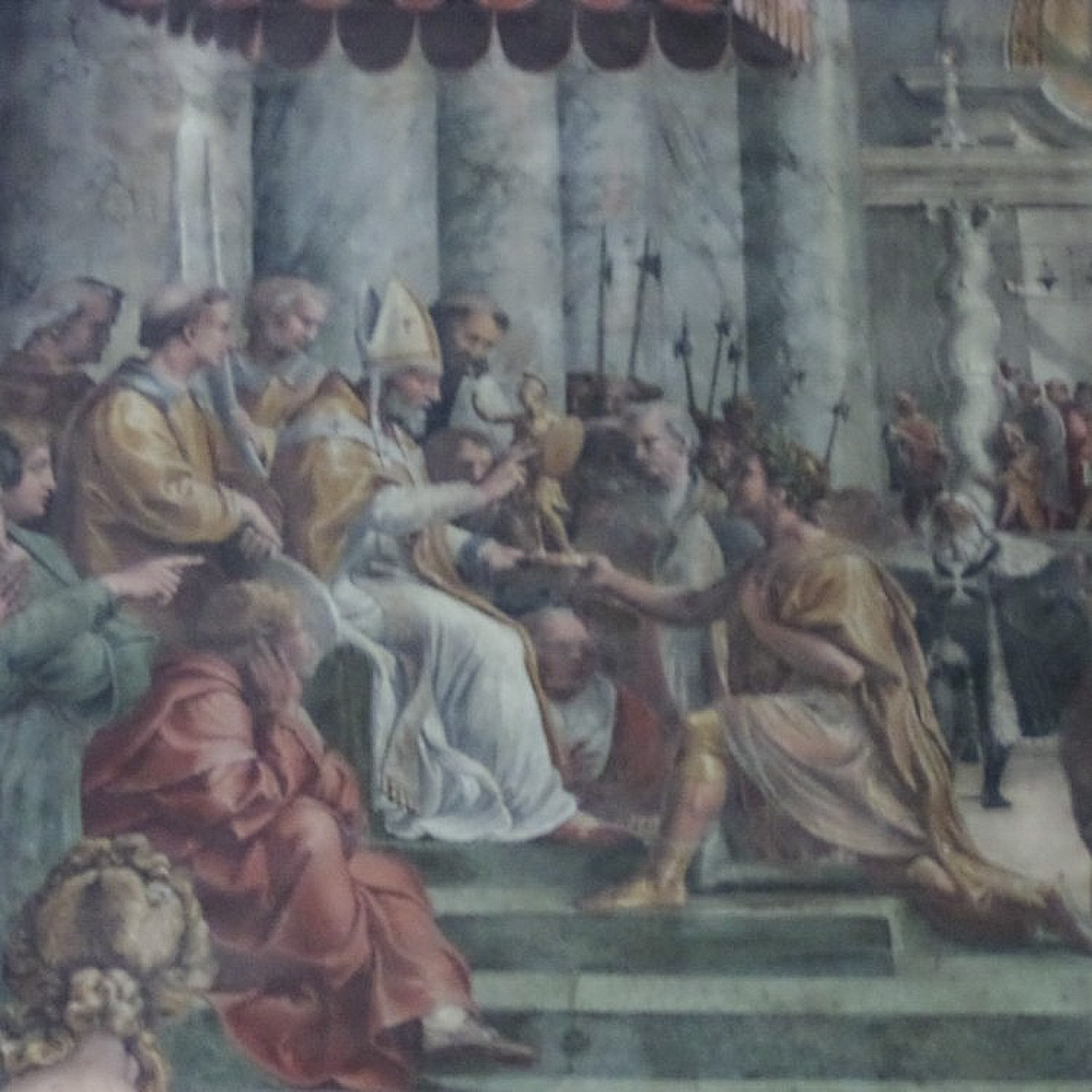 Multiple photos are associated with this record. Please click the links to view all of the items in the series. These photos were taken in the Hall of Constantine (Sala di Costantino) within the Raphael Rooms, which is part of the Vatican Museums. These are public museums that display about 20,000 of 70K works collected by the Catholic Church and the papacy throughout the centuries. The museums were founded by Pope Julius II in the early 16th century. Only the Louvre in France receives more annual visitors than the Vatican Museums. The museums consist of 24 galleries, with the Sistine Chapel being the last room visited. The Hall of Constantine is one of four "Raphael Rooms." These photos show the "Donation of Constantine" (also known as "Donation of Rome"), which is the fourth wall painting in the sequence of four in this room. This fresco was painted by Raphael's pupils from drawings by the master. It depicts Constantine handing the pope, who is enthroned under the red baldachino, a gold statuette as a symbol of Rome. The architecture of the scene is that of Old St. Peter's Basilica, which was destroyed in the 16th century. Citizens of Rome are depicted in the fresco observing the proceedings.