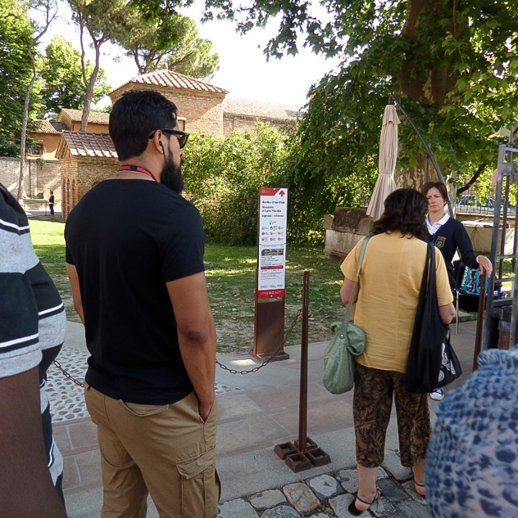 The Basilica of San Vitale (Basilica of St. Vitale; Church of Saint Vitale) and the Mausoleo di Galla Placidia (Galla Placidia Mausoleum; Mausoleum of Galla Placidia) are geographically close in Ravenna, Italy. In this photo the tour group pauses beside directional signage for both UNESCO World Heritage sites.