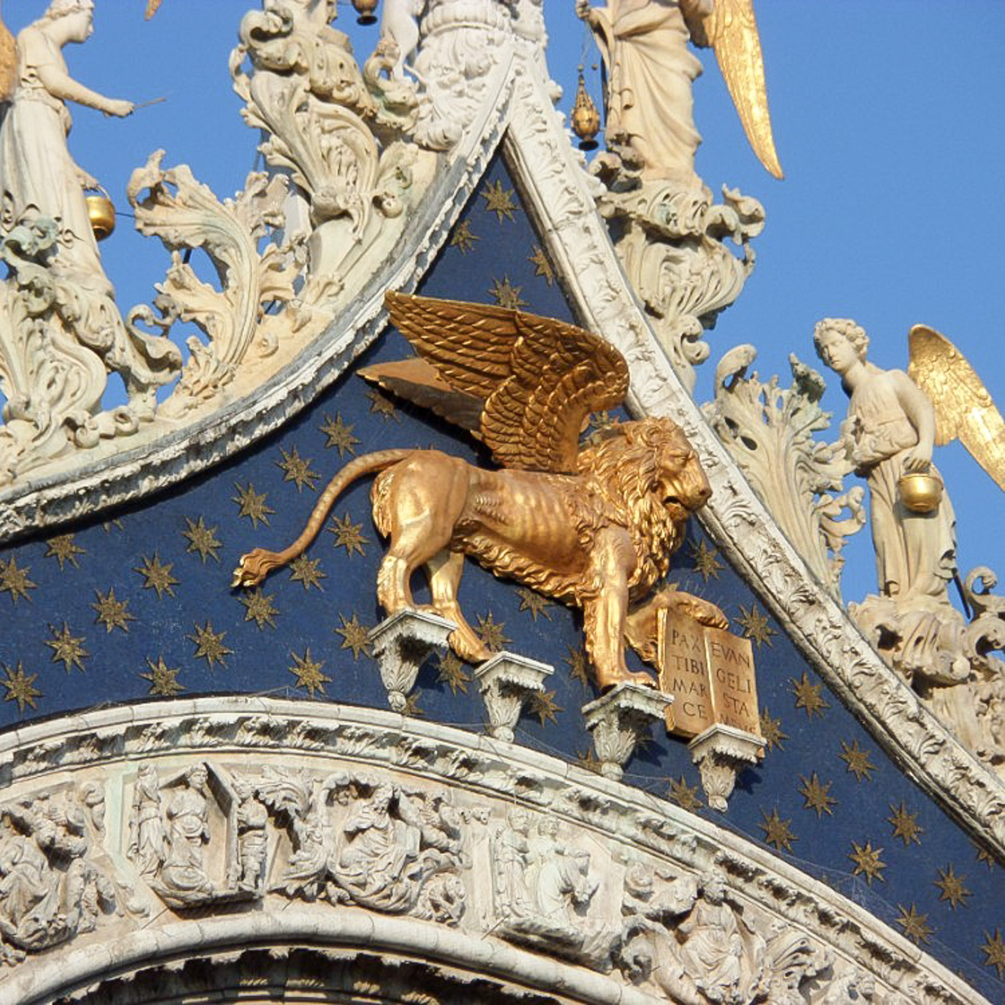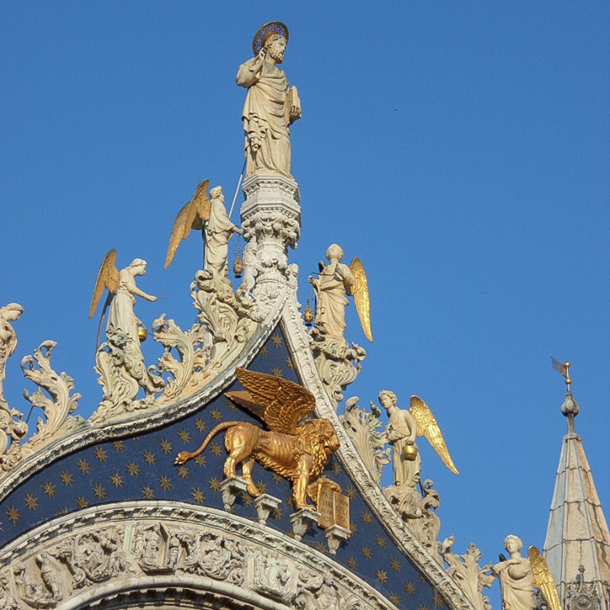 Italy , Venice , Venezia , San Marco , Basilica of St. Mark's , St. Mark's Basilica , Patriarchal Cathedral Basilica of Saint Mark , Basilica Cattedrale Patriarcale di San Marco , Basilica di San Marco , Basilicas , Central Pediments , St. Mark in Art , Saint Mark in Art , Lions in Art , Angels in Art , Evangelists in Art , Church Facades