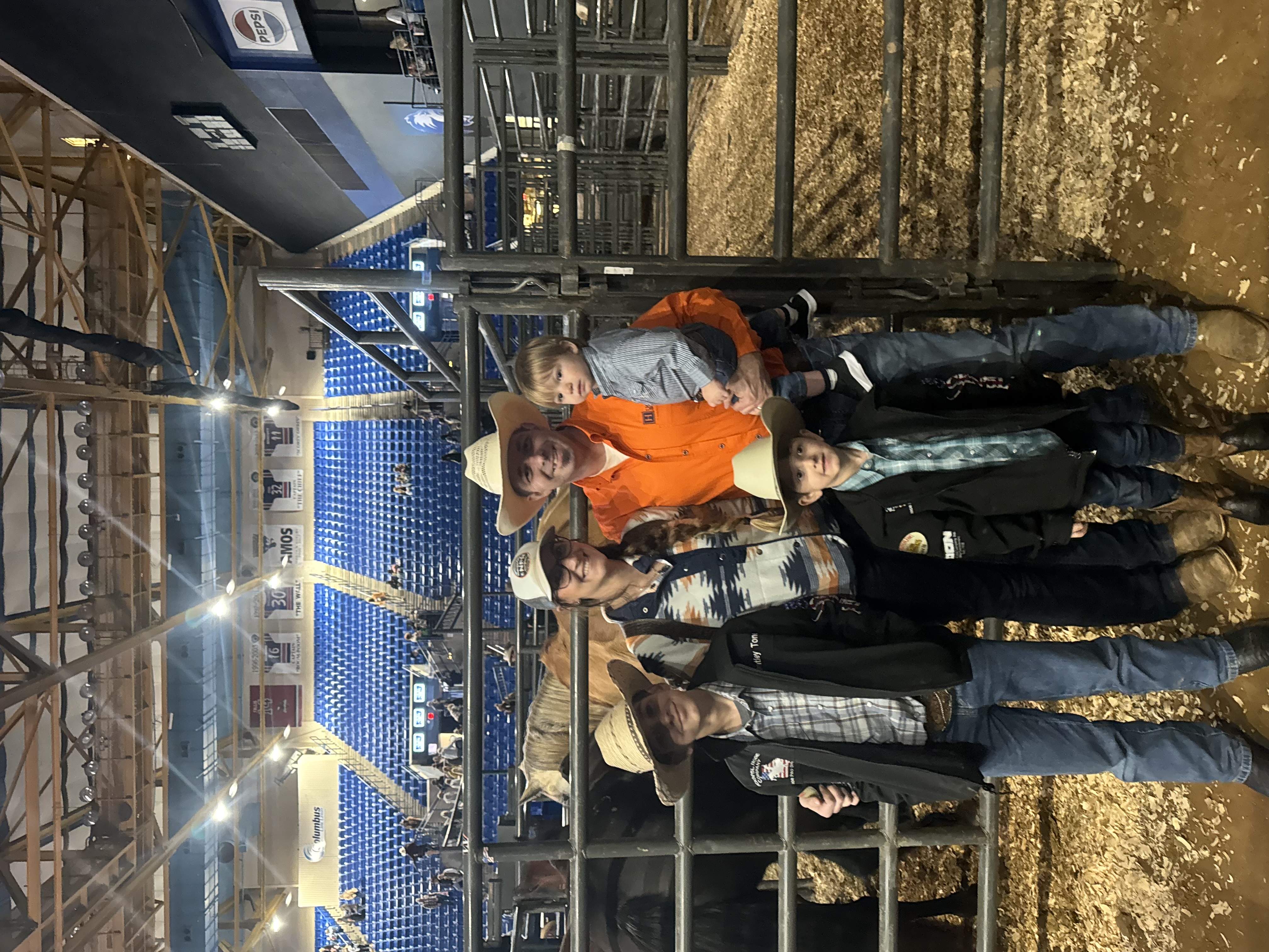 This photograph is of a family of five who are standing in front of a horse corral in a show barn or arena. There is straw on the floor and a horse in the background. In the far distance there are stadium style seats. The two eldest children and the father are wearing cowboy hats.