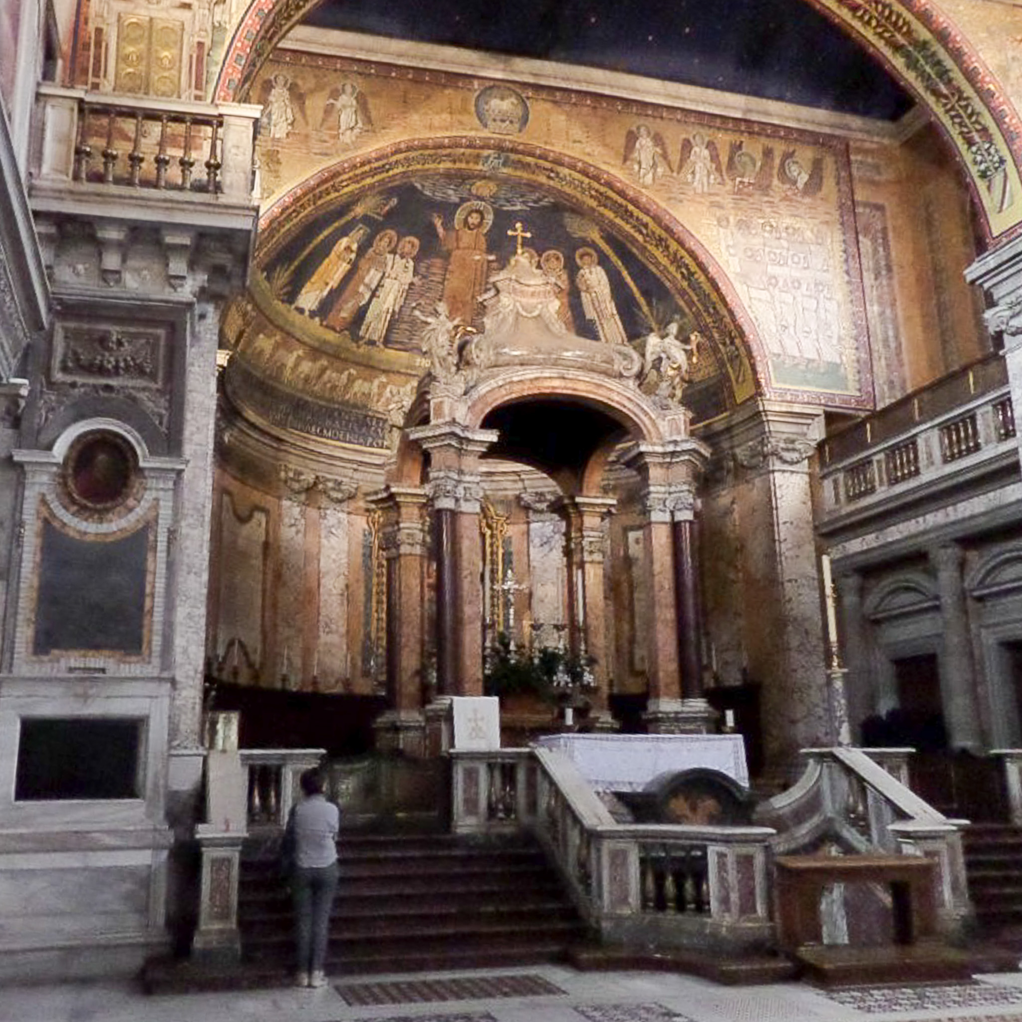 Italy , Rome , Basilica di Santa Prassede all Esquilino , Basilica of Saint Praxedes , Apses , High Altars , Baldachins , Corinthian Columns , Mosaic Floors , Cosmateque Floors , Byzantine Art , Mosaics , Porphyry Columns , Triumphal Arches , Jesus Christ in Art , Saints in Art , Saint Praxedes in Art , Saint Prudenziana in Art , Saint Zeno in Art , Pope Paschale I in Art , Second Coming of Christ in Art , Halos in Art , Saint Peter in Art , Saint Paul in Art