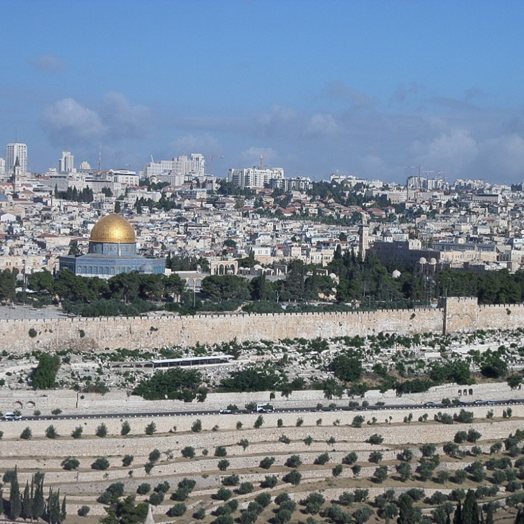 Panoramic shot of the eastern side of the Old City as viewed from the eastern slope of the Kidron Valley.