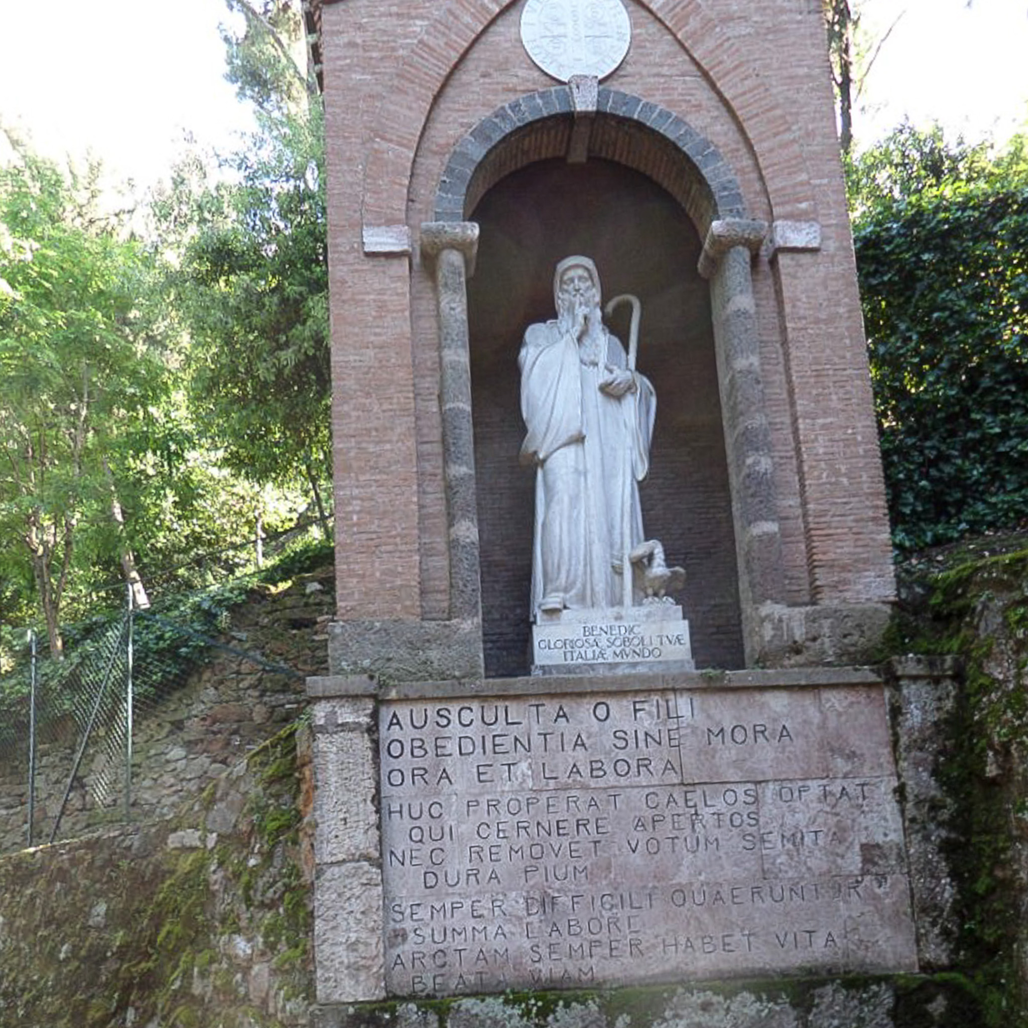 Four miles outside the city of Rome, Italy is the Abbey of the Three Fountains, run by Cistercian monks belonging to the Trappist order. It contains three churches, of which the Church of Saint Paul at the Three Fountains (Church of the Martyrdom of Saint Paul; San Paolo alle Tre Fontane; Church of St. Paul the Apostle) is most sacred. This church was built on the site where Saint Paul was beheaded on 29 June 67 CE, in accordance with Emperor Nero's order. As a Roman citizen, Saint Paul could not be executed within the city. The other two churches in the complex are the earliest one: the Benedictine Church of Saint Vincent and Saint Anastasius, built in 626; and the 16th century Roman Catholic Church of Saint Maria Scala Coeli, where Saint Paul stopped to pray for the last time before he was beheaded. The legend is that Paul's head bounced three times and fountains sprang up at each spot; hence, the title of "Three Fountains." Actually, fountains already existed at the site when Paul was beheaded. Shown in the photograph is a statue of Saint Benedict, which is near the entrance of the Via delle Acque Salvie, a quiet and tree-lined gated street that leads to the complex. This marble statue is placed in a simple aedicula (a niche for a statue, used as a shrine). The Latin inscription at its base, translated to English, is: "Listen, oh son: obedience without delay. Pray and work. Here those who desire to see the open heavens hasten; and the hardness of the path does not distract him from his holy purpose. Difficult things are always achieved with great effort. The blessed life always passes through a narrow path."