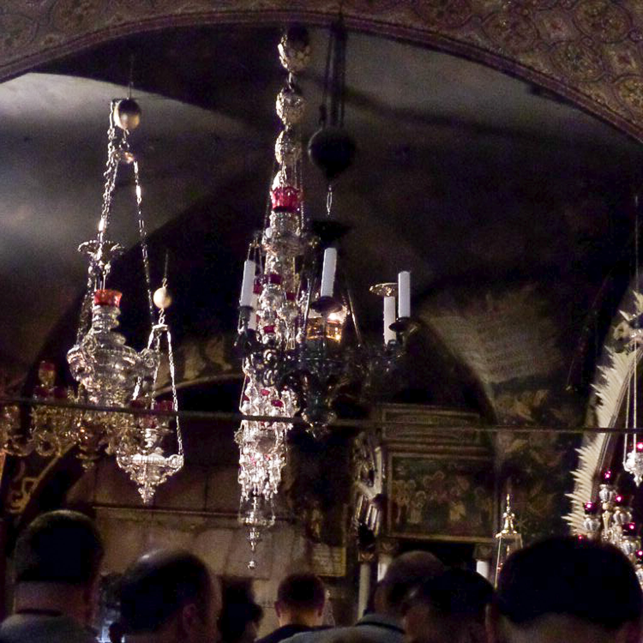 Lanterns hanging in the chapel dedicated to the place on Golgotha where Jesus was crucified. The chapel is in the western gallery.