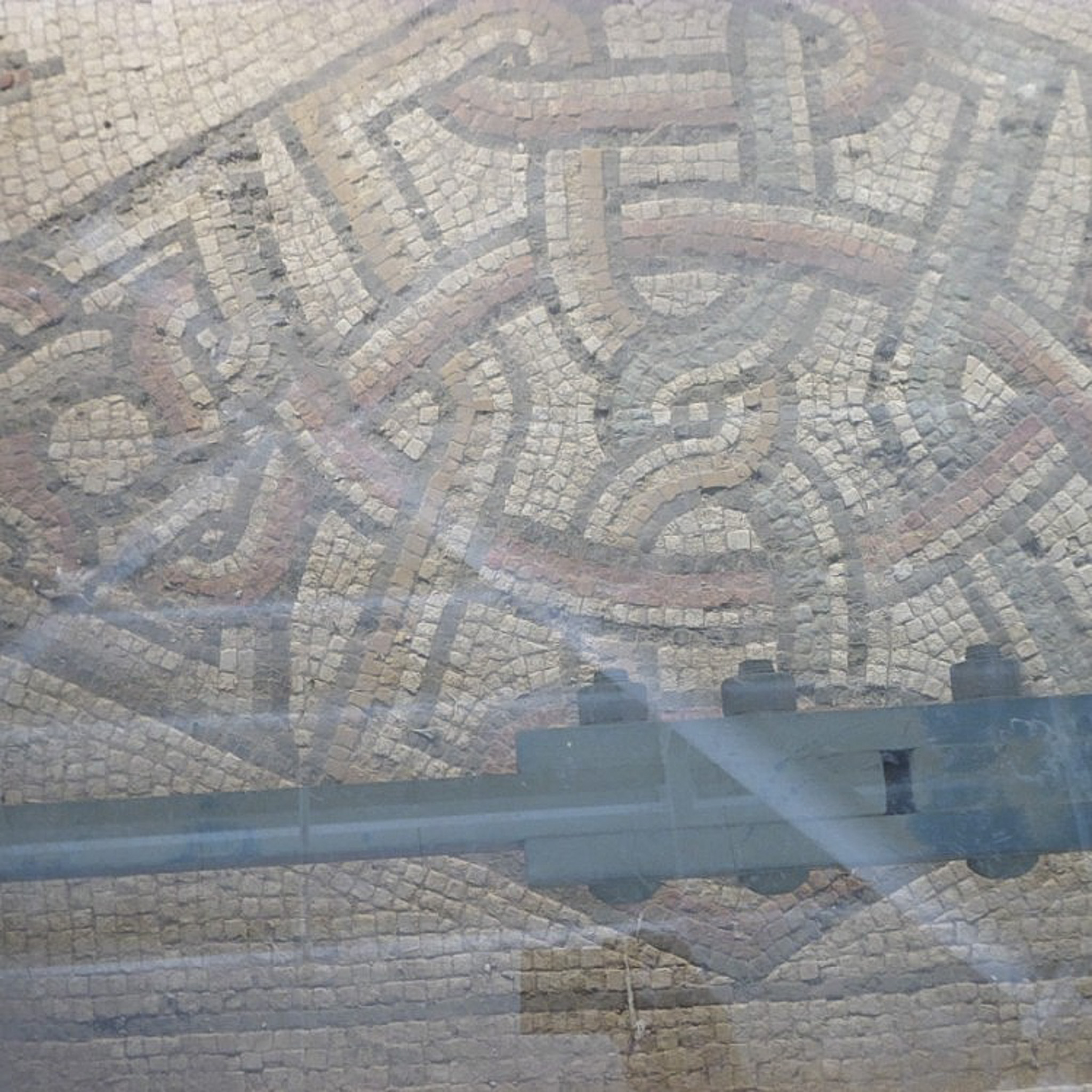 A braided knot design is featured on one section of the mosaic floor in the audience hall.