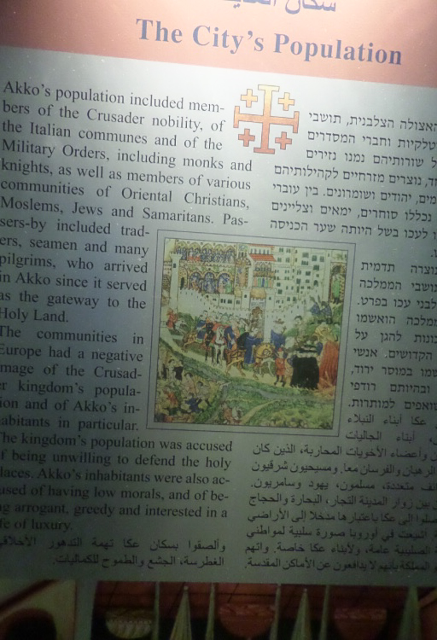 Because Acre was a port city, its population was diverse. This sign within the crusader fortress highlights that fact for visitors to the site.