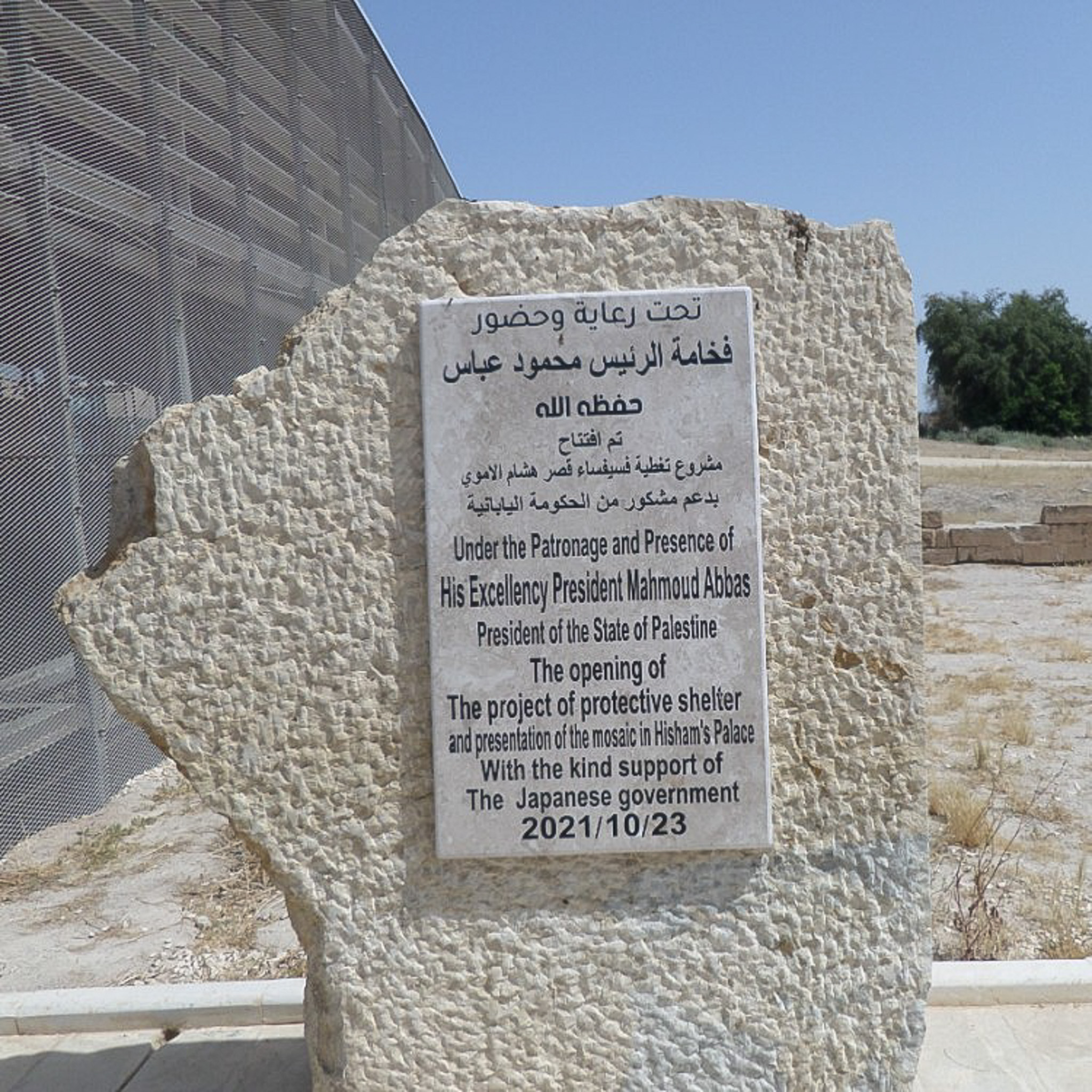 Signage for the covered structure that protects the audience hall mosaics reads: Under the patronage and presence of His Excellency President Mahmoud Abbas, President of the State of Palestine -- The opening of the project of protective shelter and presentation of the mosaic in Hisham's Palace with the kind support of the Japanese Government 2021/10/23.
