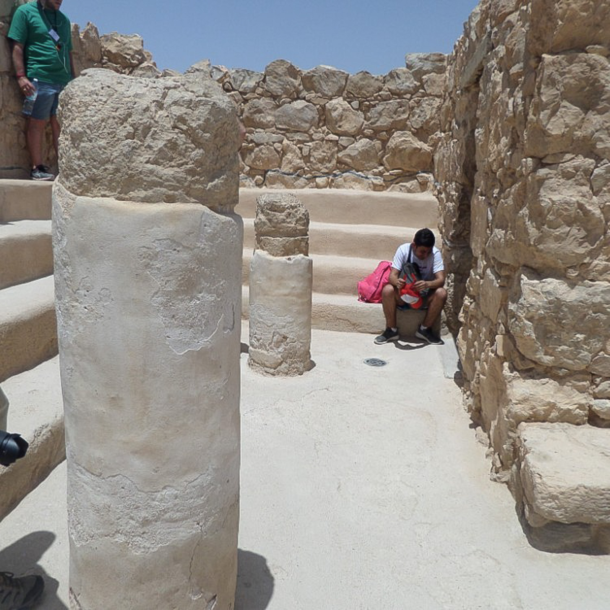Columns and bench seats in the structure that was used as a synagogue during the Jewish-Roman War.