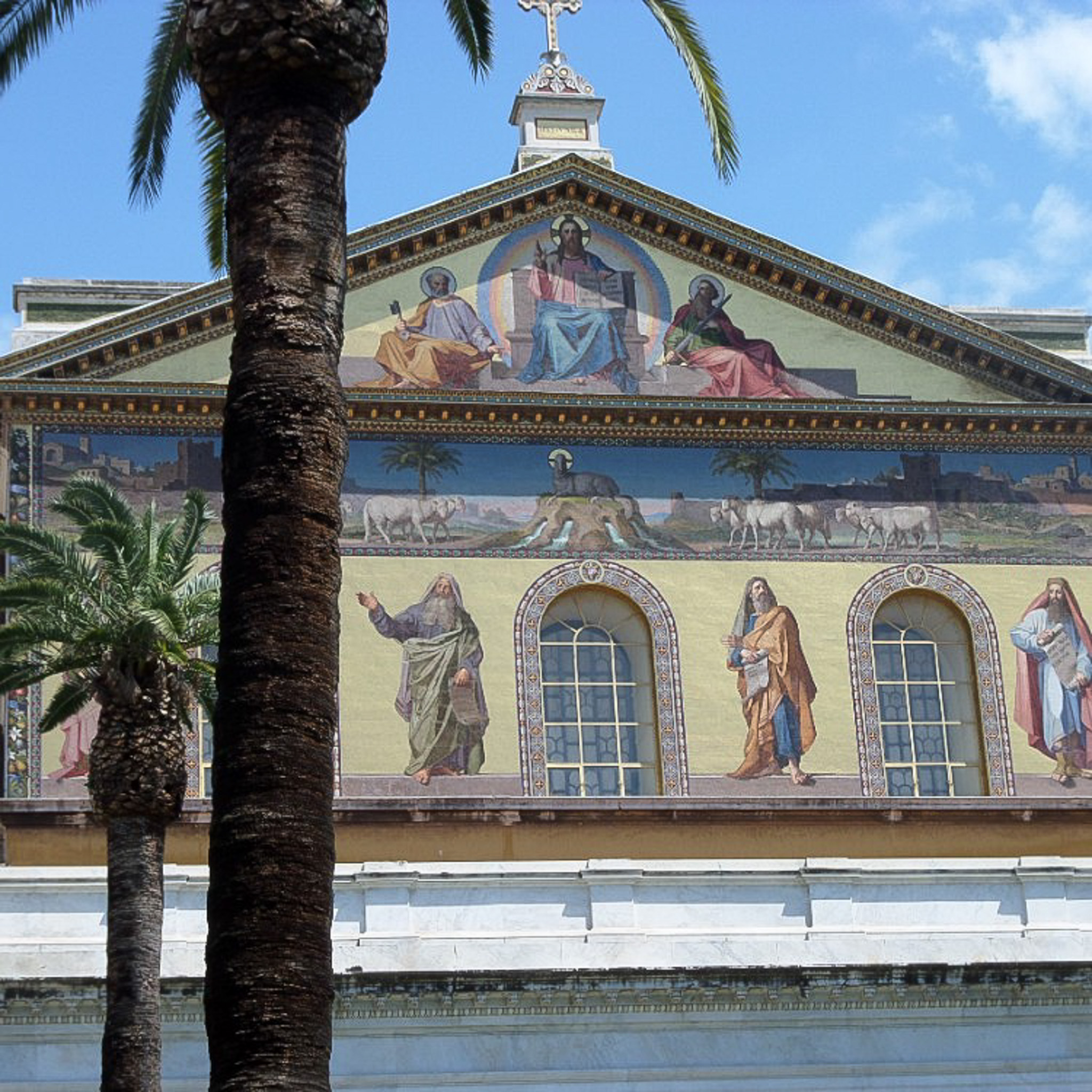 The facade of the Papal Basilica of Saint Paul Outside the Walls (Rome, Italy). According to https://www.vatican.va/various/basiliche/san_paolo/en/basilica/esterno.htm: "The facade is decorated by mosaics which were done between 1854 and 1874 (based on the designs of Agricola and Consoni). They depict: in the lower section, Isaiah, Jeremiah, Ezekiel and Daniel and in the central section, the mystical Lamb surrounded by four rivers which symbolize the four Gospels, and by twelve lambs representing the twelve Apostles. In the upper section, Christ is situated between Peter and Paul."