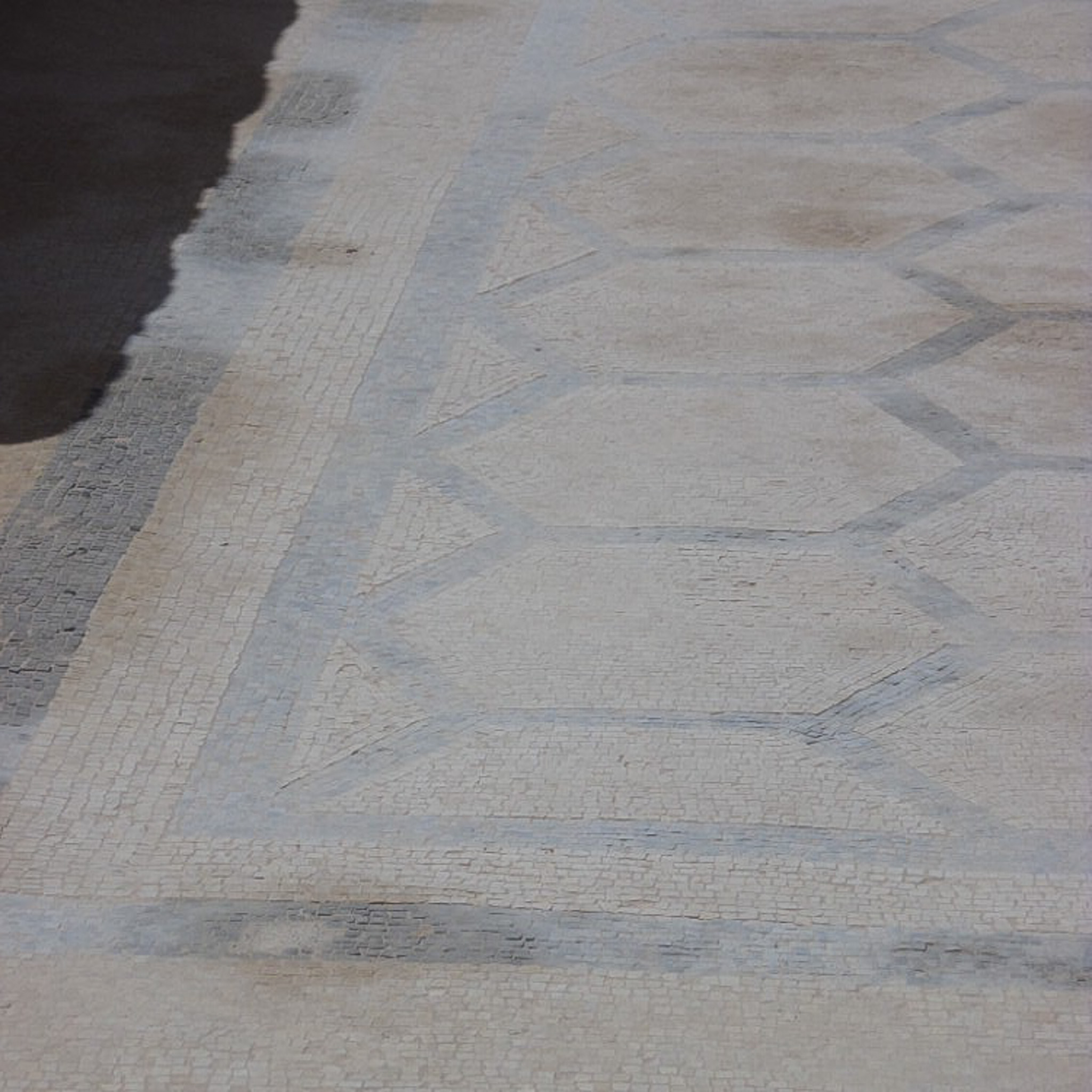 The hexagonal shapes of the mosaic floorr in the upper level of Herod's palce are formed by yellow and black tessarea (small square stones).
