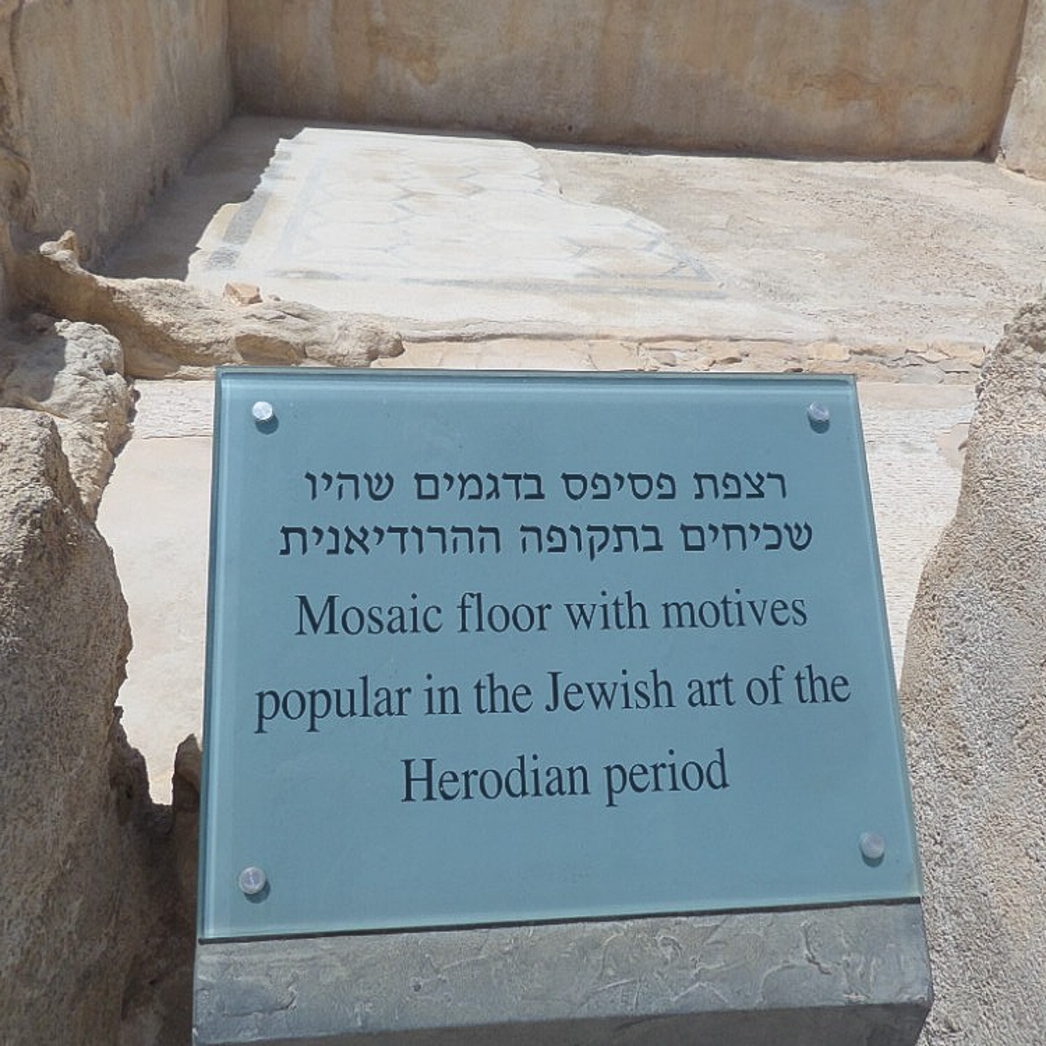 A mosaic floor in the Northern Palace's upper terrace. A sign indicates that the design was typical of Jewish art in the Herodian period.