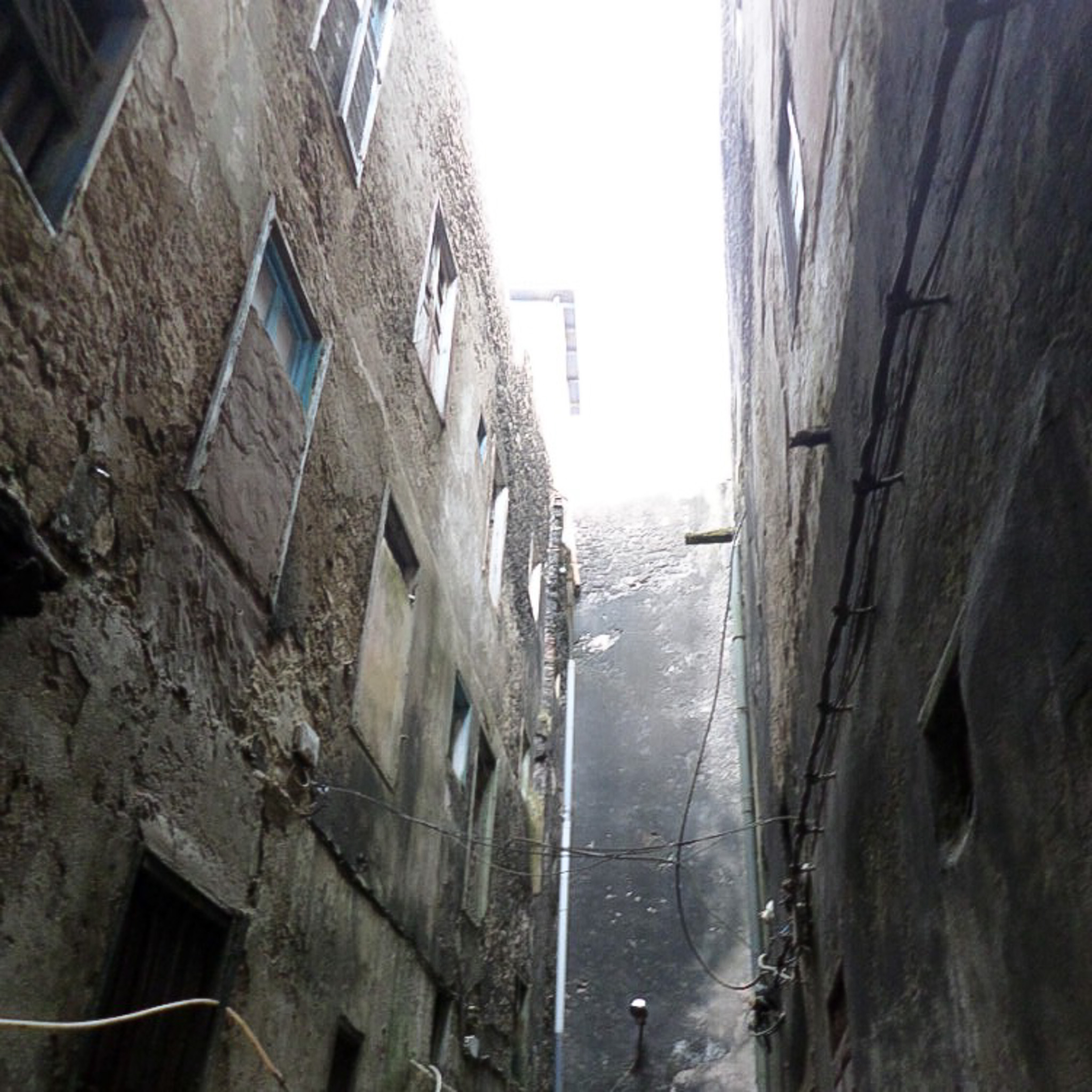Photo showing placement of electric cables attached overhead on and between buildings.