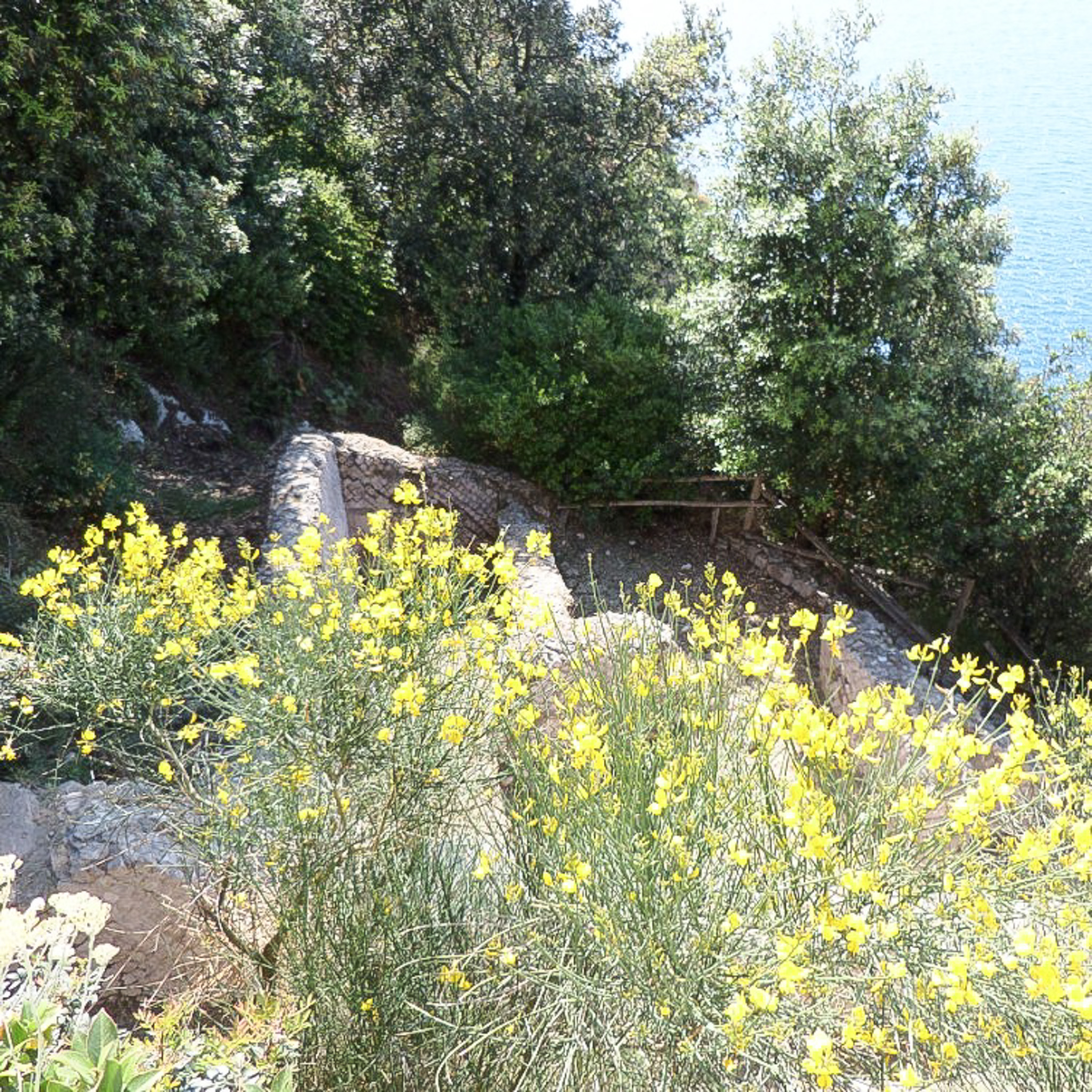 Walking downward at the remains of Villa Damecuta, which is one of twelve Augustan-Tiberian Roman villas on the Island of Capri, Italy. The Roman villa is in ruins today due to the eruption of Vesuvius in 79 A.D. and many raids by pirates. The ruins is located a short walk between the Blue Grotto and the municipality of Anacapri. "Damecuta" is derived from "Domus Cuta" (Dark and Hidden House), as Emperor Tiberius preferred small living spaces similar to caves. Augustus was the first Roman emperor and was succeeded by his stepson, Tiberius. The foreground of the photograph shows a yellow flower, which could be the common broom, or Scotch broom. According to capri.com: "Broom (Spartium junceum) . . . flowers on Capri each year from May until June. On the island there are various species belonging to the Broom family, such as the thorny Chamaecytiscus spinescens and the Cytisus scoparius or Common Broom with intense yellow flowers. There is a very special relationship between the broom plant and the two districts of the island, Capri and Anacapri: in Capri it is called the 'flower of St. Costanzo', Costanzo being the patron saint of the island, honored on May 14th, when the broom is in its period of maximum flowering; in Anacapri it is called the 'flower of St. Antonio', after patron saint of Anacapri, because here it flowers later on in the year, towards mid June, when the celebrations in the Saint's honor are held."