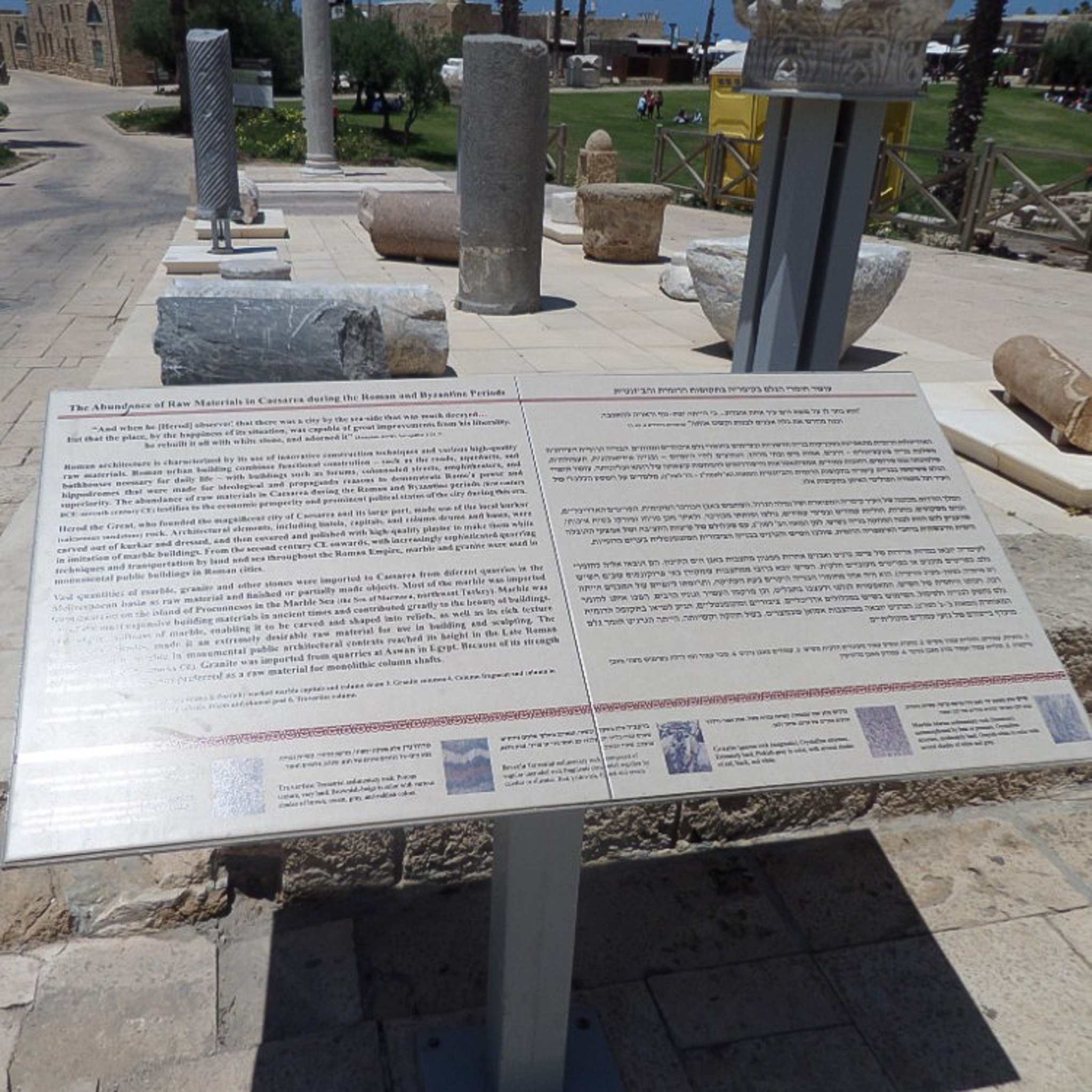 Signage about the building materials available in Caesarea during the Roman and Byzantine periods.