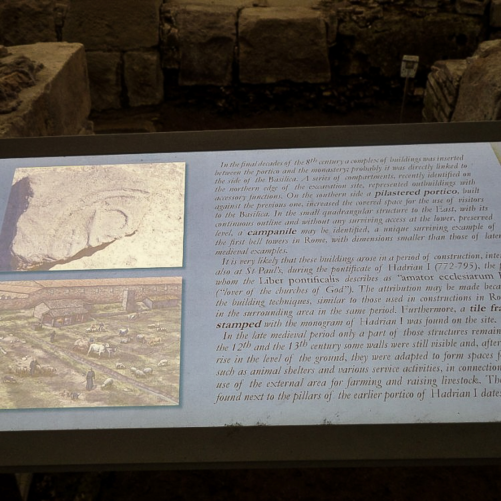 Signage for the archaeological site at the Papal Basilica of Saint Paul Outside the Walls (Rome, Italy).