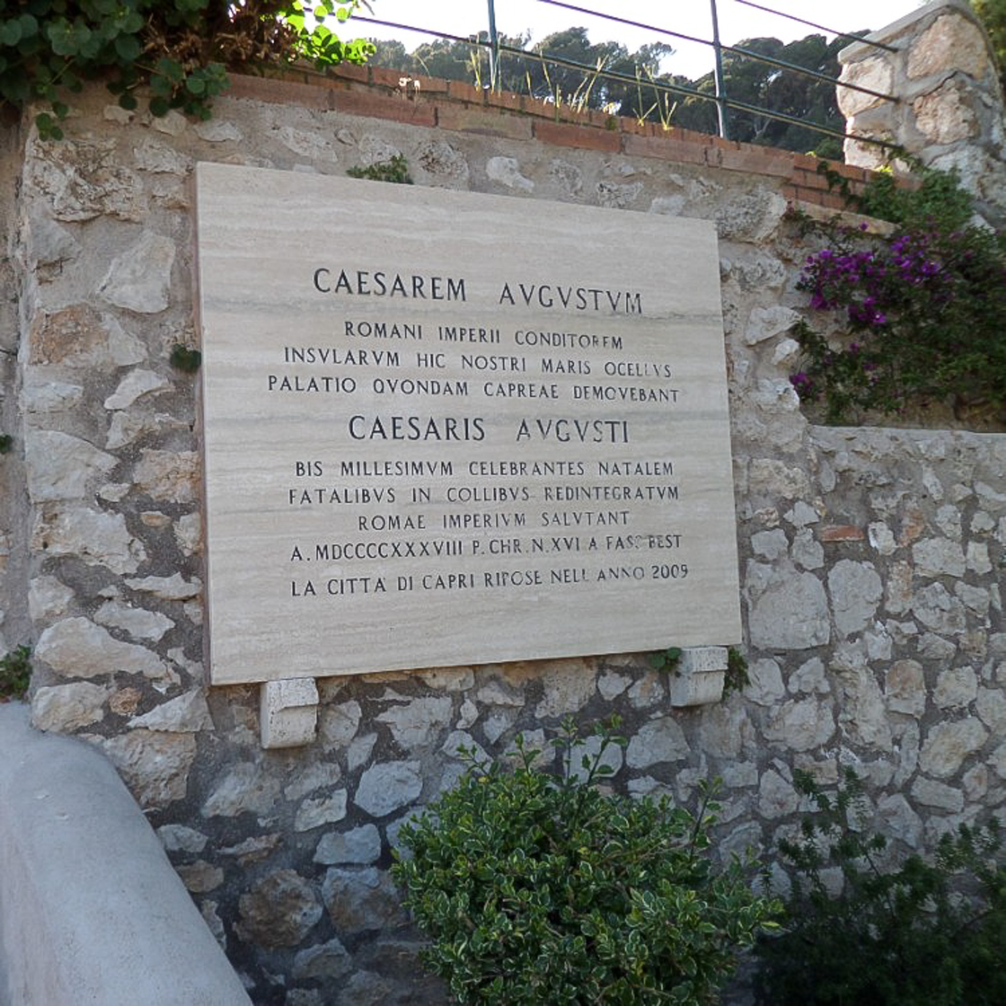 Signage for the Gardens of Augustus (Giardini di Augusto). These are botanical gardens on the island of Capri, Campania, Italy. The gardens were established by the German industrialist Friedrich Alfred Krupp in the early twentieth century when he built his mansion on Capri, and were known until 1918 as Krupp Gardens. The gardens are designed in terraces overlooking the sea.
