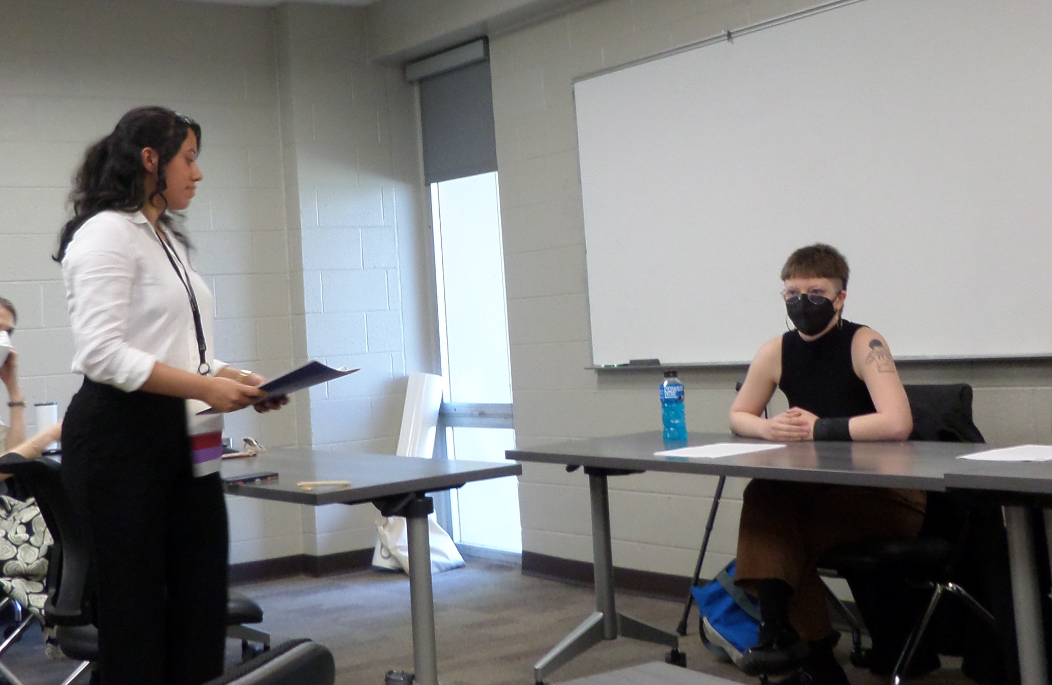 During the session, "medievalsdiditfirst", moderator Karen Rodas poses a question to Rowan Stamatellos. Presentations for this session of Scholars' Day were held in Pafford Hall.