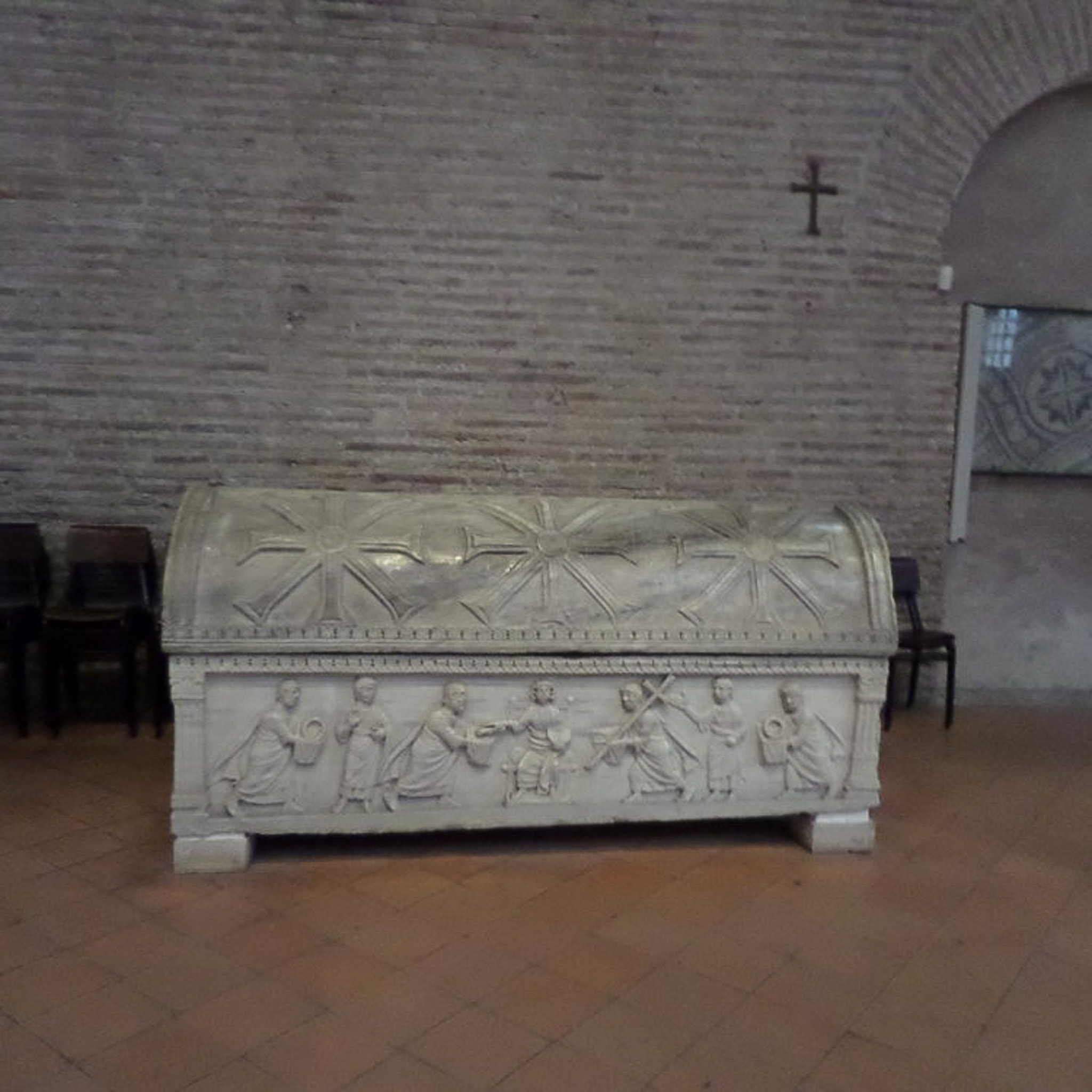 Many sarcophagi, dating from the 5th to 8th centuries, line the lateral walls of the nave in the Basilica of St. Apollinare in Classe (or Basilica of Sant'Apollinare in Classe, or Saint Apollinaris in Classe), which is located in Ravenna, Italy. This sarcophagus depicts human figures.