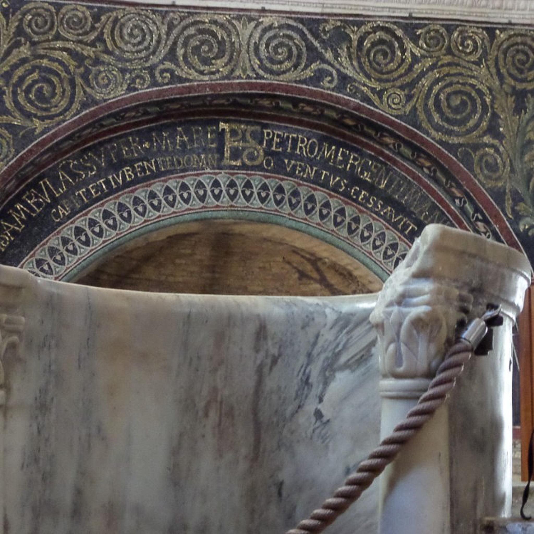 Image taken in the Baptistery of the Orthodox (Neonian Baptistery; Baptistery of Neon; Battistero Neoniano; Orthodox Baptistery; Battistero Ortodosso; Baptistry of the Cathedral). The photograph shows the central baptismal font of marble with the mosaic decorations of the lowest register of the Baptistery in the background.